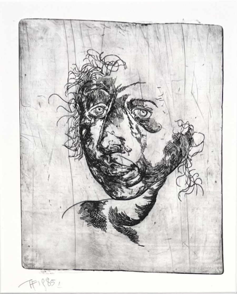 Ets op papier van Theo Forrer (1923–2004), uitgevoerd in expressieve grafische stijl. Het portret toont een hoofd met vervormde trekken, opgebouwd uit krachtige lijnen en arceringen. Linksonder met potlood gesigneerd TF en gedateerd 1985. De zichtbare plaatrand en krassporen rond het beeldvlak wijzen op ambachtelijke druktechniek.