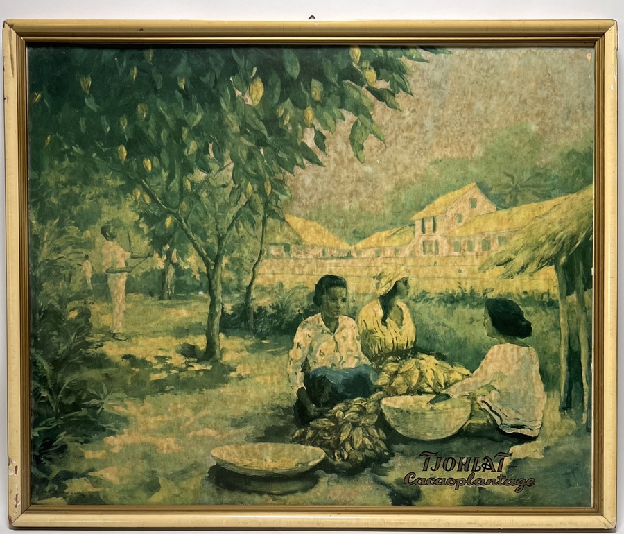 Een ingelijst winkelplakkaat voor Tjoklat Cacaoplantage, ontworpen door Frits van Bemmel (1898-1981), omstreeks 1935. Het reclameobject, gedrukt op papier, toont een geïdealiseerde scène op een cacaoplantage met figuren en gebouwen. De stijl is realistisch, met een zacht kleurenpalet. De tekst "TJOKLAT Cacaoplantage" is prominent aanwezig.