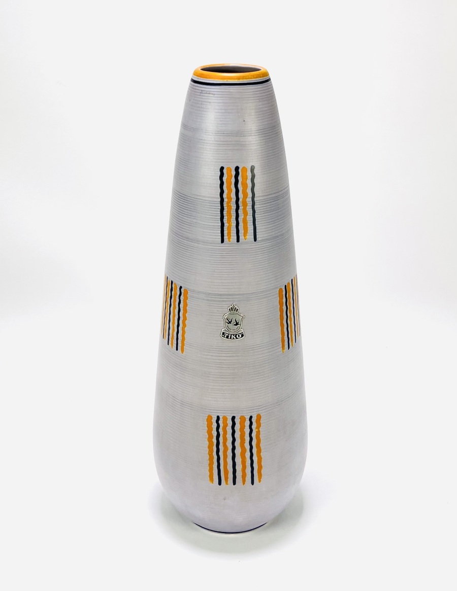 Vaas uit steengoed, vervaardigd door Plateelfabriek Tiko (België) jaren '60, model “1020 Calvo”. Handgedraaid met lavendel grijze ondergrond en verticale banen in zwart, geel en oranje. Typisch voor de modernistische naoorlogse vormgeving. Onderaan gemerkt met modelnummer en decornaam, voorkant voorzien van originele fabriekssticker met Tiko-logo.