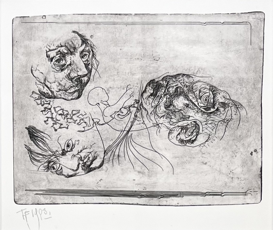 Ets van Theo Forrer (1923–2004), uitgevoerd in zwart op wit papier. Het werk toont een surrealistische compositie met expressief vervormde hoofden en lineaire verbindingsstructuren. Linksonder gesigneerd T. Forrer en gedateerd 1983. Gedrukt binnen zichtbare plaatranden met decoratieve accenten. De stijl is grafisch en introspectief, met nadruk op lijnvoering en emotionele vervreemding.