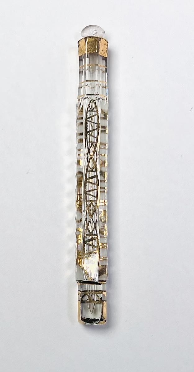 Kristallen Victoriaanse tranenvanger uit circa midden 19e eeuw, vervaardigd uit transparant geslepen kristal met vergulde metalen accenten. De langgerekte, taps toelopende vorm met facetgeslepen oppervlak en trechtervormige opening weerspiegelt het gebruik als rouw- en herinneringsobject. Uitgevoerd in handgeslepen kristal met vergulde monturen.