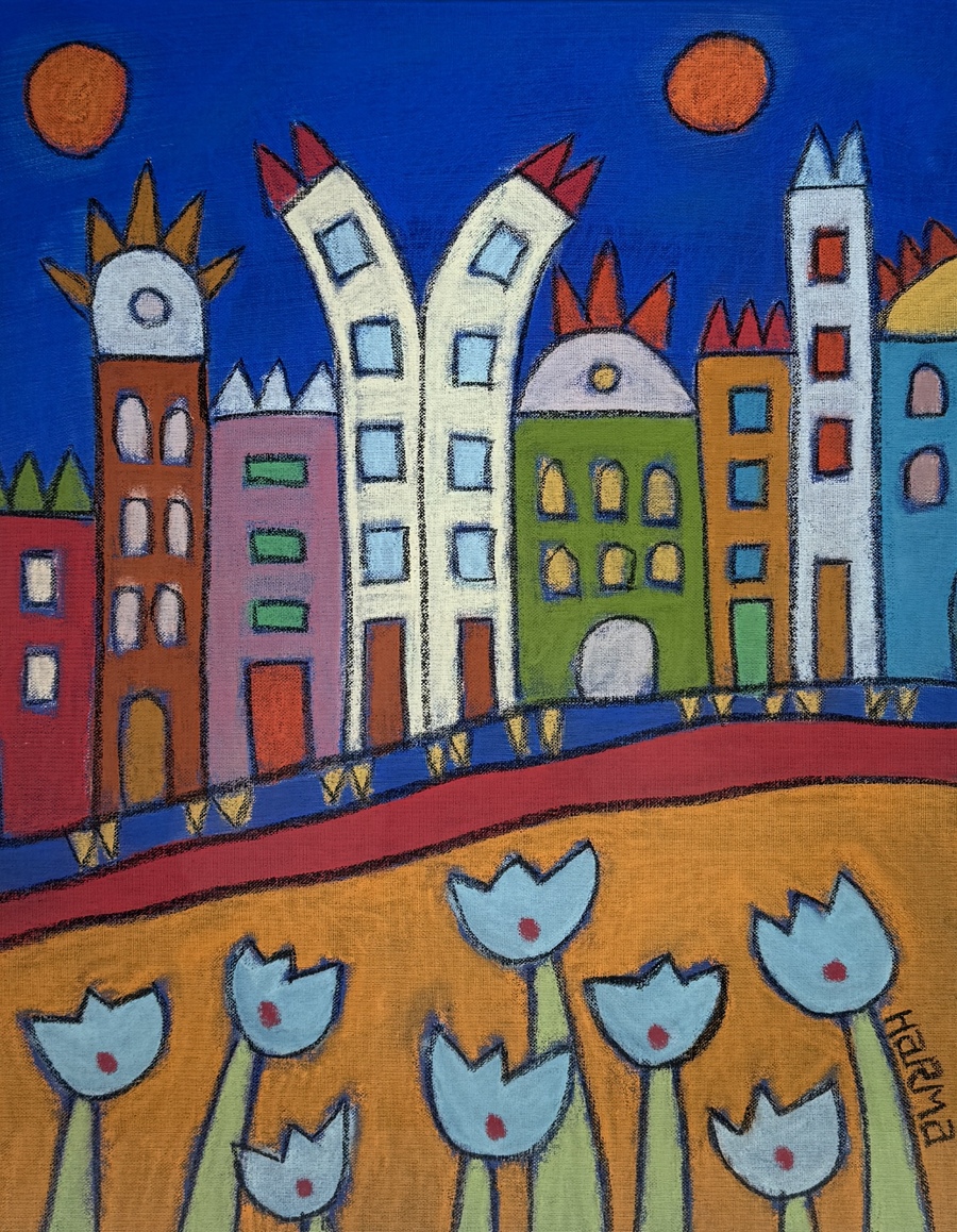 Schilderij van een stadsgezicht met tulpen, rechtsonder gesigneerd Harma, uitgevoerd in acrylverf op doek. Naïef-expressionistische stijl met sterk vereenvoudigde vormen, contrastrijke kleurvlakken en zwarte contourlijnen. Afgebeeld zijn gestileerde gebouwen onder een blauwe hemel met oranje zonnen, en bloemen op de voorgrond.