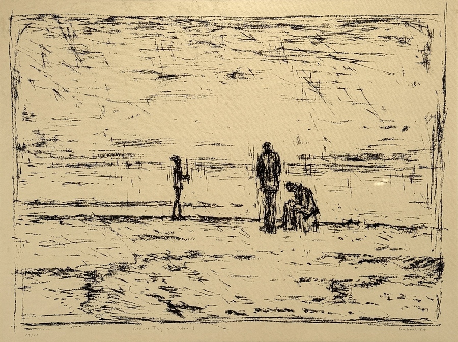 Litho uit 1987 onduidelijk gesigneerd rechtsonder. Uitgevoerd op papier en gedrukt in een oplage van 20 exemplaren. Voorstelling van drie gestileerde menselijke figuren aan het strand van Cannes, weergegeven in expressieve zwarte lijnen op een effen ondergrond. Titel “... Tag am Strand” midden onder in potlood. Rechtsonder met potlood gesigneerd, linksonder oplagenummer 11/20.