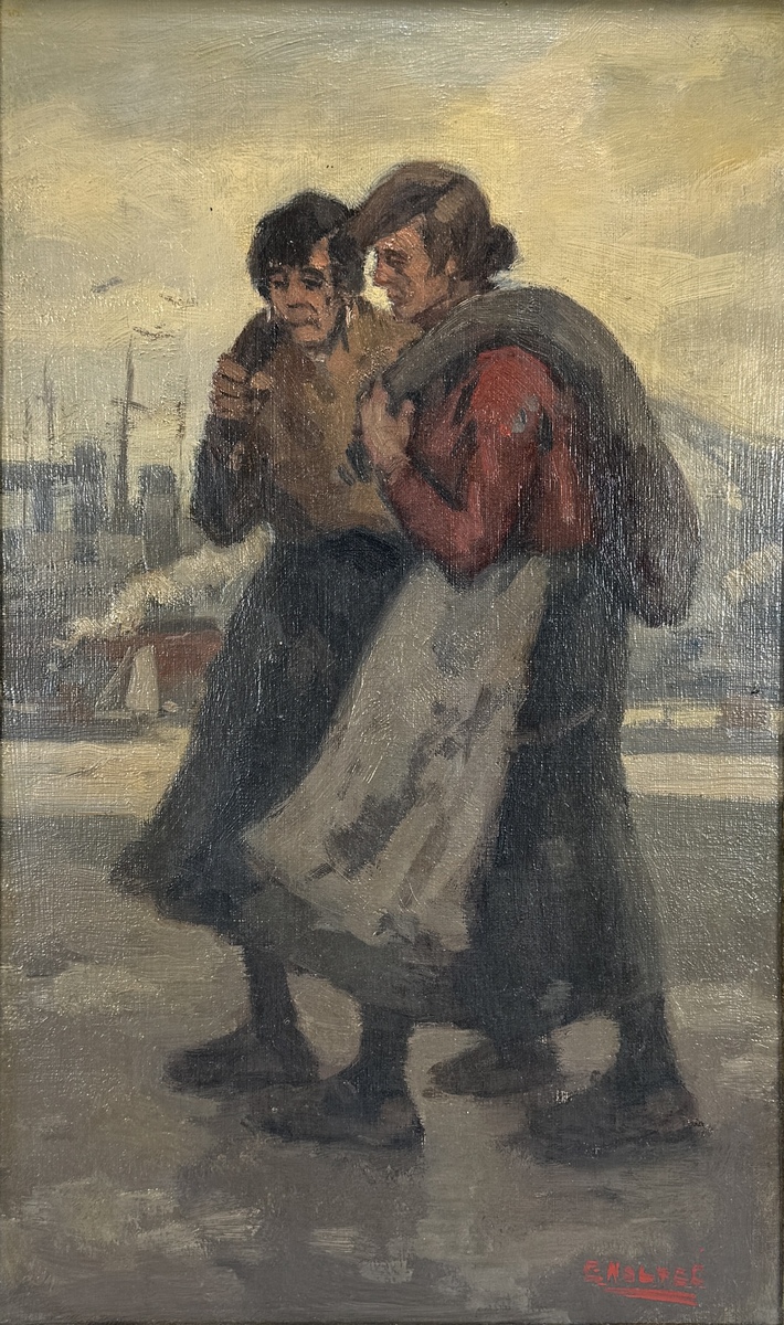 Schilderij van Cor Noltee (1903–1967), uitgevoerd in olie op doek in sociaal-realistische stijl. Afgebeeld zijn twee vrouwenfiguren in een industriële havenomgeving met nadruk op onderlinge steun en arbeid. Begin 20e eeuw. Rechtsonder gesigneerd C. Noltee in rode verf. Gevat in goudkleurige geornamenteerde houten lijst.