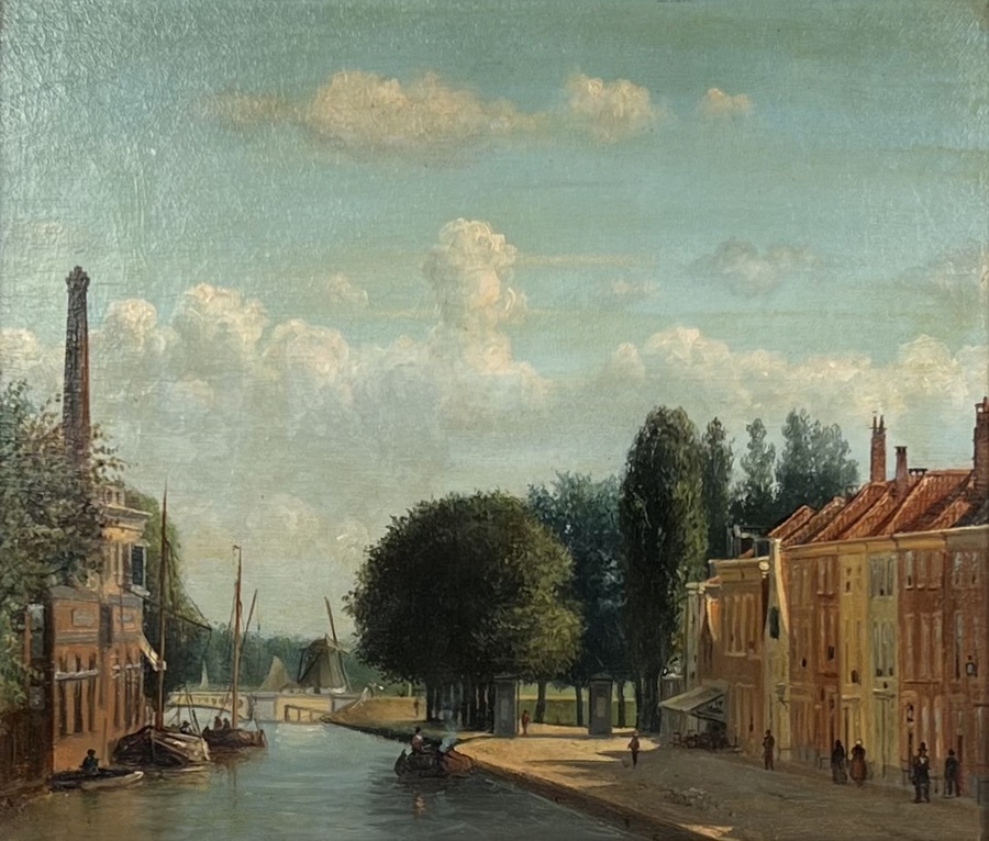 Schilderij olieverf op paneel, uitgevoerd in de stijl van het post-romantisch realisme, Nederland, eind 19e eeuw. Rivier/kanaalzicht met klassieke bebouwing, schepen, bomenrij en een molen in de diepte. Subtiele lichtwerking in de lucht en reflecties op het water. Ongesigneerd. Herkomst gemarkeerd door een etiket van kunsthandel Bosman & Co., actief in Den Haag en Dordrecht.