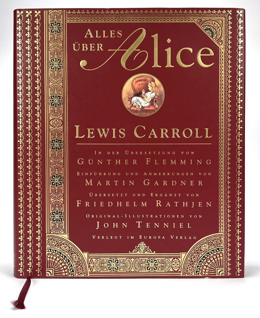 Boek "Alles über Alice"van Lewis Carroll (1832–1898), Duitstalige vertaling door Günther Flemming, uitgegeven door Europa Verlag, Hamburg/Wien. Bevat Alices Abenteuer im Wunderland en Durch den Spiegel und was Alice dort fand, met inleiding en annotaties van Martin Gardner, vertaald door Friedhelm Rathjen. Rood linnen met goudopdruk, decoratieve band, leeslint en stofomslag, geïllustreerd door John Tenniel. Enkele onderstrepingen en noteringen in de marges met potlood.