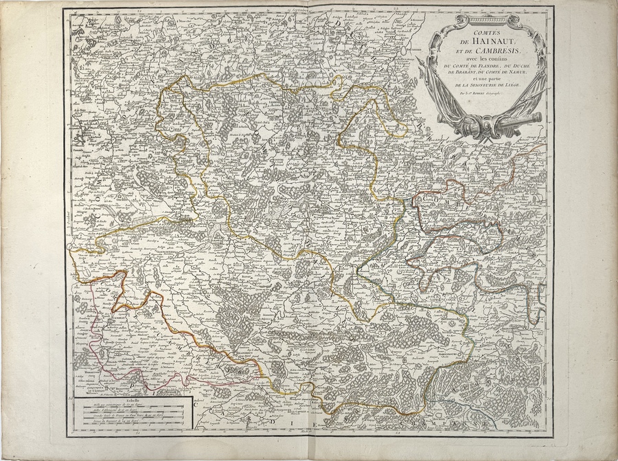 Antieke kaart van Gilles Robert de Vaugondy (1688–1766), uitgevoerd in kopergravure met handmatige contourinkleuring, gedateerd 1754. Titel “Comtés de Hainaut et de Cambrésis” met omliggende gebieden als Vlaanderen, Brabant en Luik. Uit het Atlas Universel. Met gegraveerde titelcartouche, middenvouw en paginanummer “60” recto.