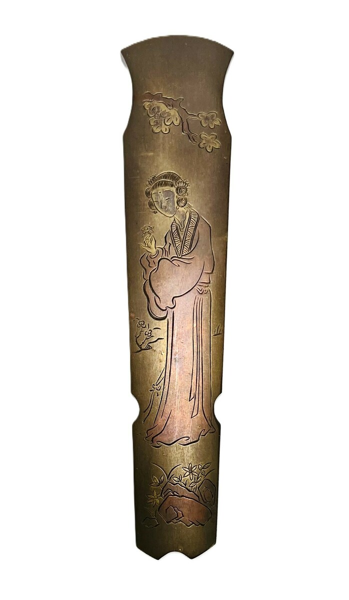 Japans messing presse-papier met gegraveerde voorstelling van een Japanse vrouw met bloemen onder bloesemtakken, uitgevoerd in traditionele stijl. De achterzijde toont een gestempeld merkteken in Japanse karakters. Omstreeks begin 20e eeuw vervaardigd. Gegraveerd en uitgesneden met symmetrische profilering en vloeiende lijnen.