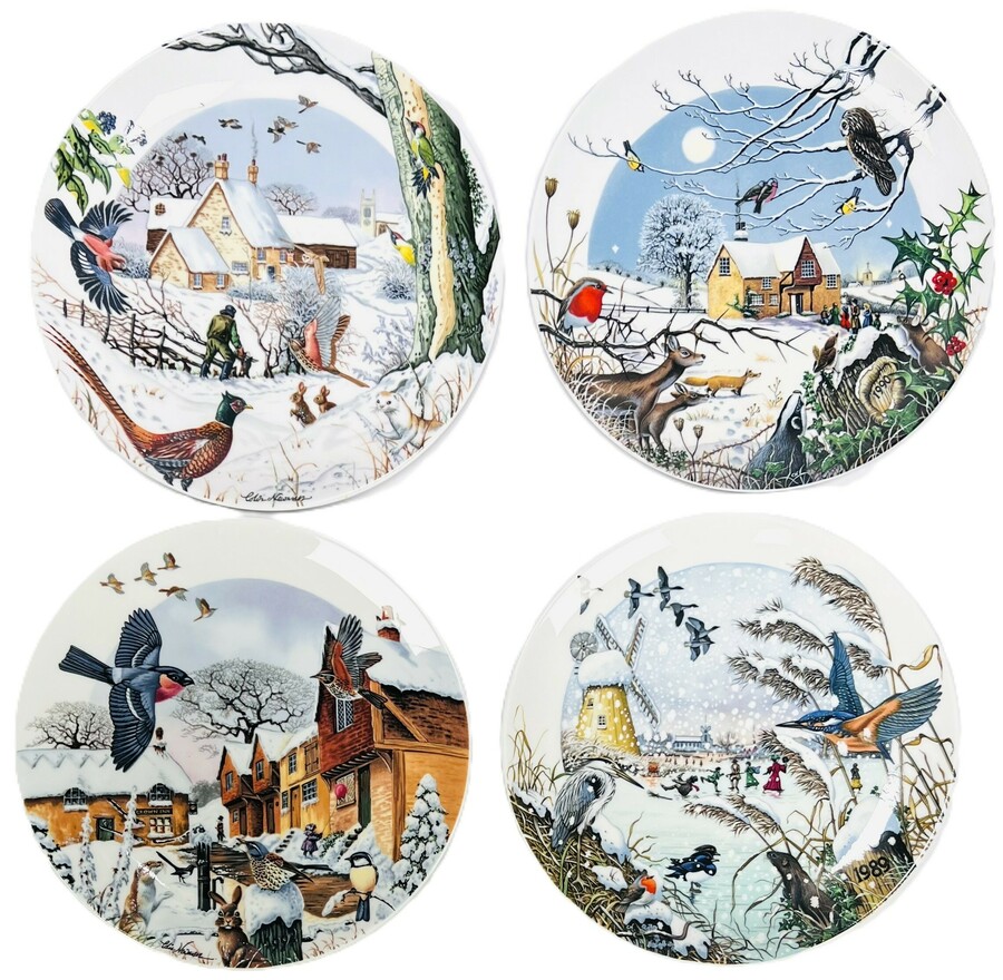 Set van vier porseleinen borden, vervaardigd door Wedgwood tussen 1989 en 1992, ontworpen door Colin Newman. Uitgevoerd in fine bone china met transferdecoratie in kleur. Elk bord toont een winters dorpslandschap met dieren of mensen, voorzien van titel, datering en serienummer op de achterzijde. Rechtsonder gesigneerd (gedrukt), uitgegeven als gelimiteerde serie Country Christmas.