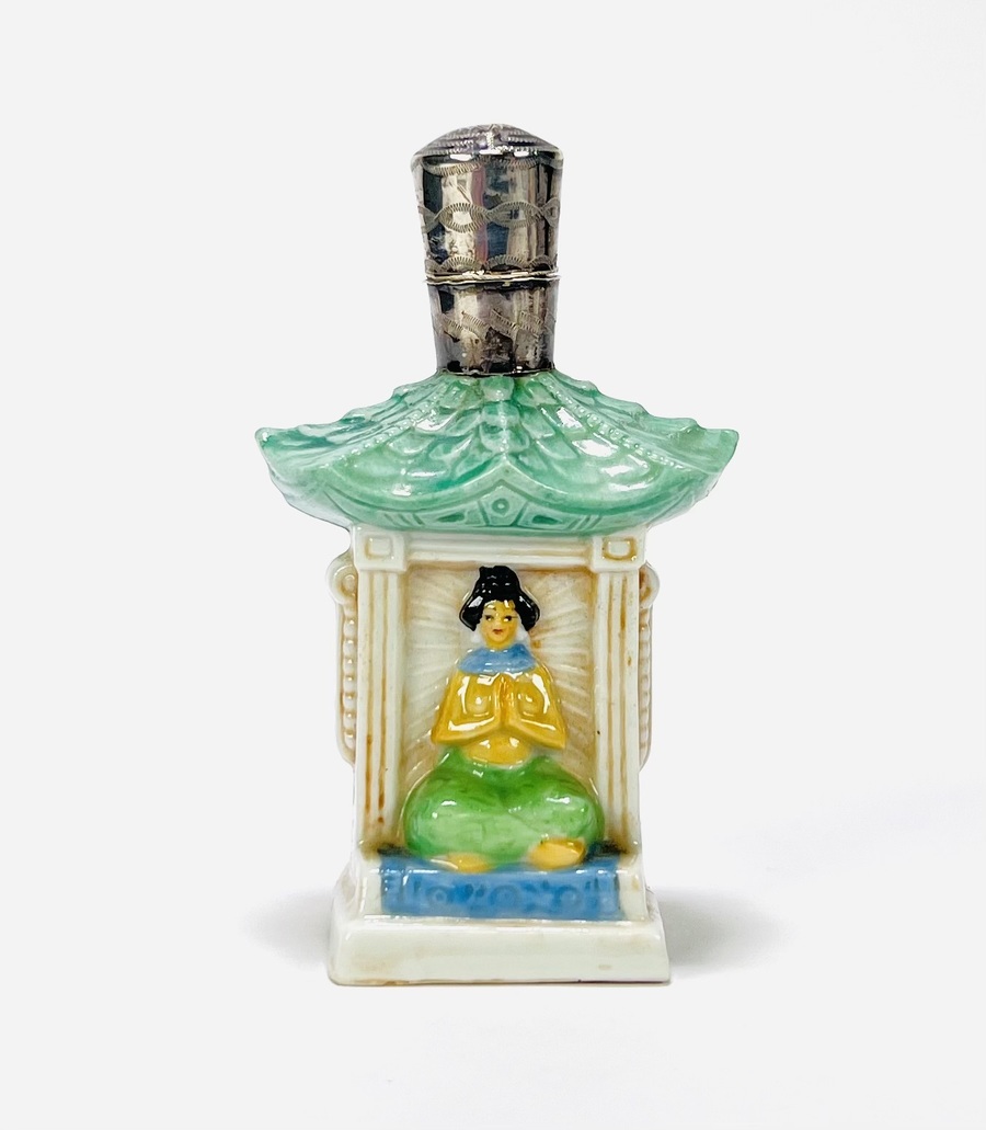 Parfumflesje in de vorm van een pagode, circa 1880–1910. Gemaakt van handbeschilderd porselein met geglazuurd groen dak en zittende figuur in een nis. De zilveren gegraveerde scharnierdop is gemerkt met twee keurmerken en een zwaardje. Uitgevoerd naar Japans voorbeeld en in Europa gemaakt.