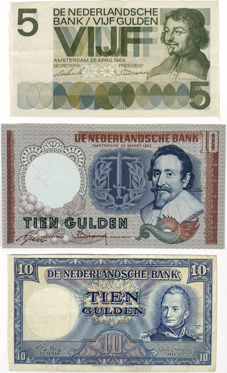Een set van drie Nederlandse bankbiljetten van vijf en tien gulden, gedateerd 1949, 1953 en 1966. Ontworpen en gedrukt door Johan Enschede en Zonen. Met portretten van Joost van den Vondel, Hugo de Groot en Koning Willem II. Technische druk met geometrische motieven, allegorieën, molenlandschap en watermerkvelden. Gedrukt op veiligheidspapier, inclusief serienummers en gedrukte signaturen.
