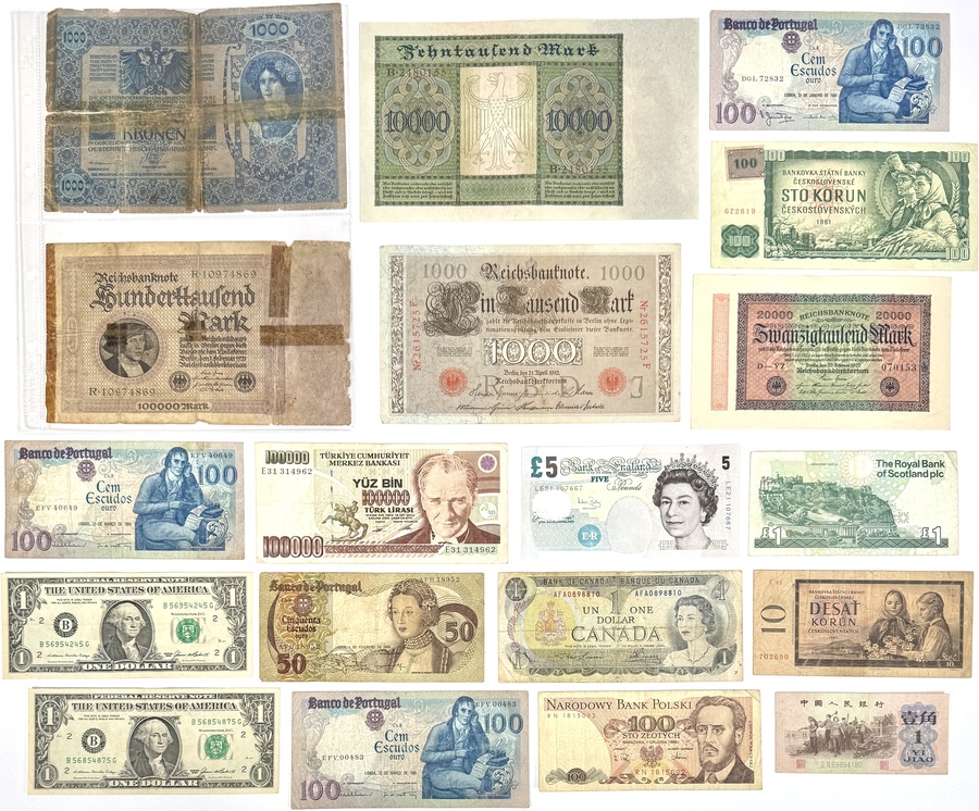 Een verzameling van 19 bankbiljetten uit diverse landen, gedateerd circa 1920-1990, waaronder Nederlandse, Duitse, Portugese, Britse, Amerikaanse, Tsjechoslowaakse, Turkse, Poolse en Chinese biljetten. De collectie toont een breed scala aan ontwerpen, variërend van figuratief tot abstract, met portretten van historische figuren, landschappen en symboliek. De biljetten zijn gedrukt met complexe beveiligingstechnieken.