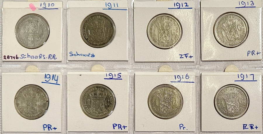 Verzameling van acht Nederlandse guldenmunten, gemaakt van zilver met een gehalte van 945/1000. De munten, geslagen in de jaren 1910 tot en met 1917, tonen aan de voorzijde een portret van Koningin Wilhelmina, ontworpen door Pier Pander. De keerzijde bevat het Nederlandse wapen van de hand van Johannes Wienecke.