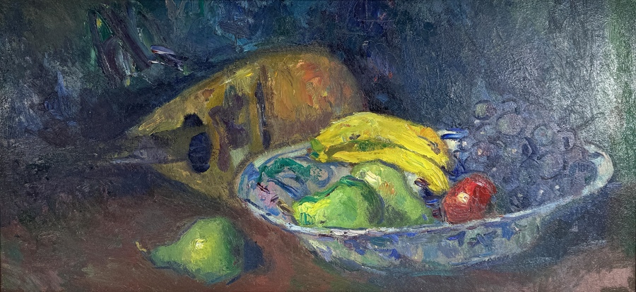 Schilderij van Jan ten Have (1903–1991), uitgevoerd in olie op paneel. Expressief stilleven met fruit in een blauwe schaal en een banjo op de achtergrond. Krachtige kleuren en brede penseelvoering typeren de compositie. Omstreeks midden 20e eeuw, gesigneerd Jan ten Have op de achterzijde.