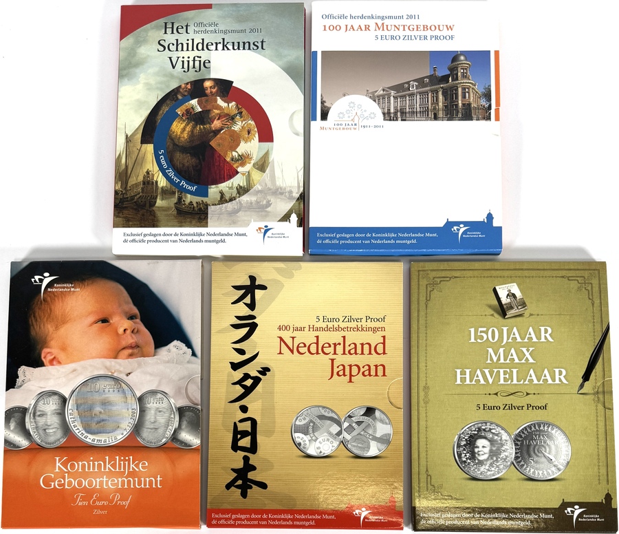 Een verzameling van vijf Nederlandse zilveren herdenkingsmunten uit de jaren 2011 en 2013. De munten, geslagen in proof kwaliteit, zijn verpakt in hun originele folders van de Koninklijke Nederlandse Munt. De ontwerpen van de hand van onder meer Evert Moes en Stani Michiels, herdenken diverse thema's, waaronder het Muntgebouw, schilderkunst, de roman Max Havelaar, handelsbetrekkingen met Japan en een koninklijke geboorte.