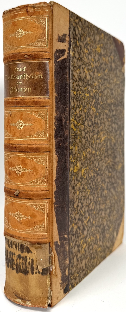 Botanisch handboek Die Krankheiten der Pflanzen van Dr. A. B. Frank (1839–1900), uitgegeven in 1880 bij Eduard Trewendt te Breslau. Het boek bevat 149 in de tekst gedrukte houtgravures van plantenziekten, en is gebonden in een halfleren band met gemarmerde platten en vergulde rug. Titelpagina midden onder gedateerd 1880. Inclusief eigendomsstempel en handschrift op schutblad.