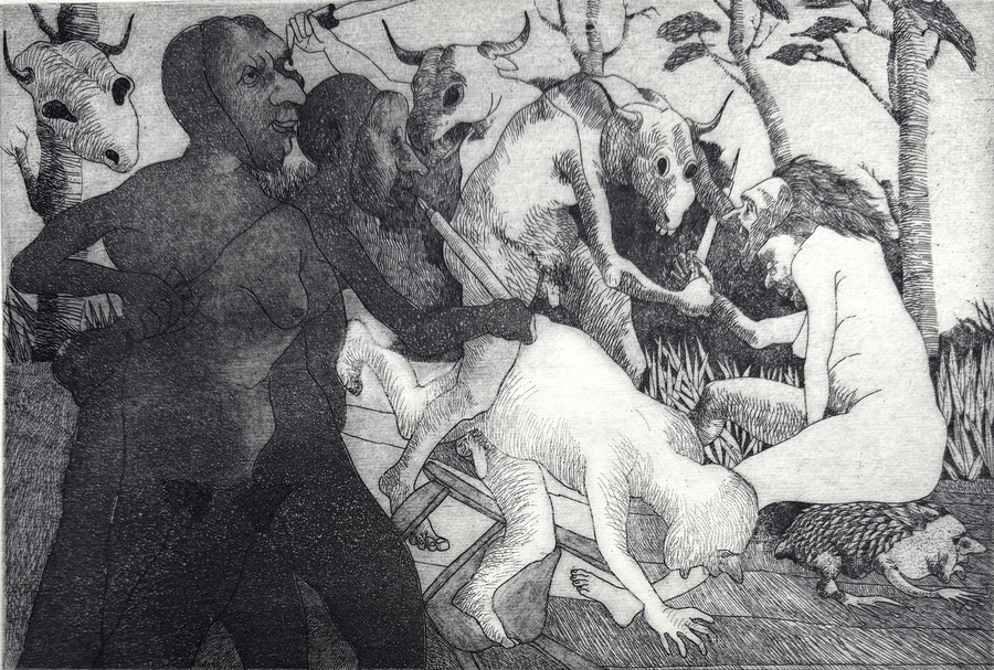 Ets met droge naald en aquatint op papier, omstreeks 1970–1980. Symbolistisch-surrealistische voorstelling van hybride mensen en dieren in een rituele scène. Met potlood gemerkt p.a. linksonder (proefdruk) en rechtsonder initiaal B. De compositie toont expressieve lijnvoering, textuur en thematische verwijzingen naar geweld en transformatie.