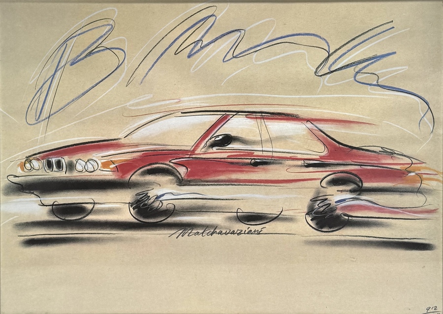 Werk op papier van Henri Matchavariani (1939–2011), uitgevoerd in gemengde techniek met krijt en pastel op papier. Horizontale voorstelling van een rode BMW in beweging, weergegeven met expressieve lijnen en vereenvoudigde vormgeving. Rechtsonder gesigneerd en rechtsonder oplagenummer 912/1000. Afkomstig uit een reeks grafisch werk uit eind 20e eeuw met focus op autoschetsen en snelheid.