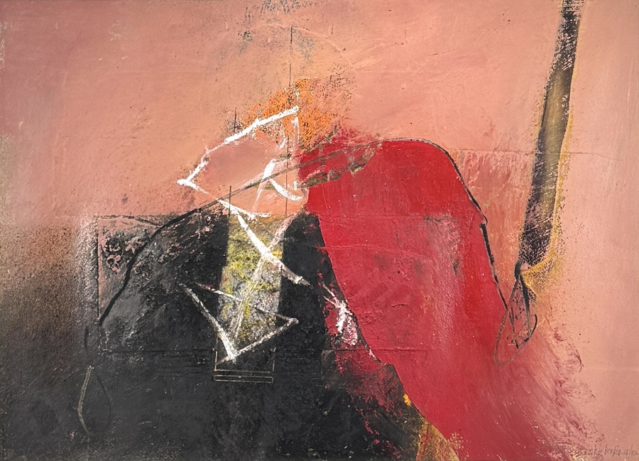 Gemengde techniek op papier, getiteld “Berookte Bergen”, uit eind 20e eeuw. Onduidelijk gesigneerd, rechtsonder voorzien van oplagenummer 14/926. Het werk toont een abstracte compositie met gelaagde kleurvlakken in rood, zwart en oker, gecombineerd met witte diagonale lijnen. Uitgevoerd met penseel, paletmes en krijt. Behoort tot de lyrisch abstracte richting binnen de moderne grafiek.