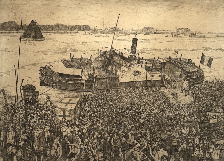 Ets van Jacques Gorus (1901–1981), midden 20e eeuw. Voorstelling van de veerboot aan Sint-Anneke te Antwerpen met een massale mensenmenigte en stadsdecor. Rechtsonder met potlood gesigneerd: J. Gorus, linksonder oplagenummer 43/50. Uitgevoerd op papier met fijne lijnvoering. In expressieve figuratieve stijl met sociaal-realistische invloeden. Inclusief boekje over de kunstenaar.