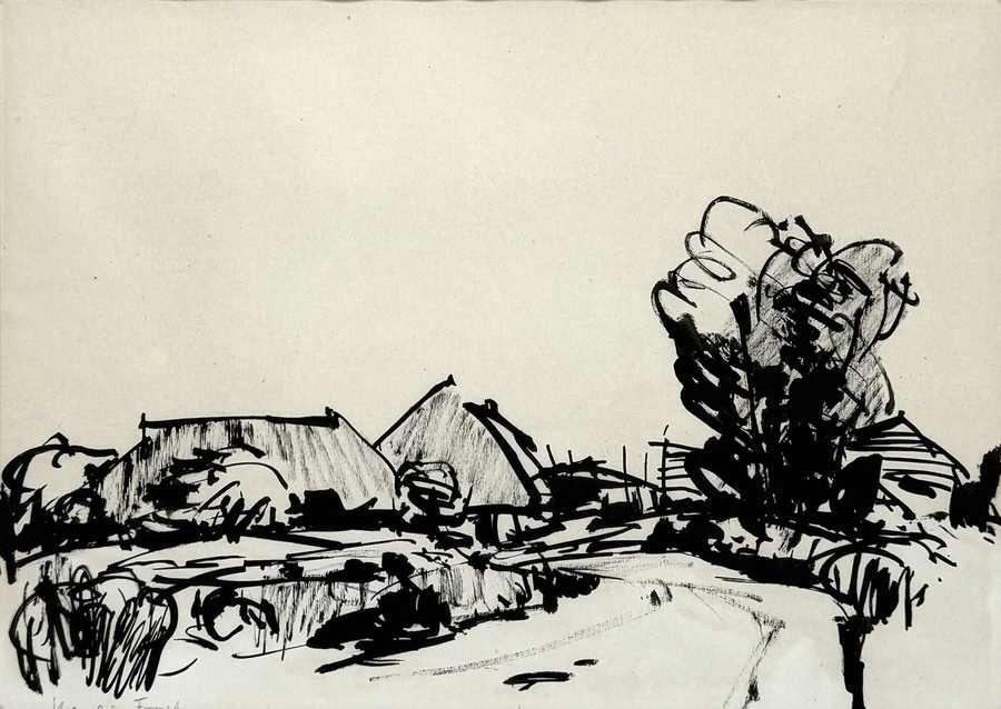 Pentekening in zwarte inkt, uitgevoerd op papier, omstreeks jaren 1960. Expressief dorpsgezicht met sterk vereenvoudigde vormen, zwart-witcontrasten en energieke lijnvoering. De voorstelling toont enkele boerderijen, een weg en bomen. Linksonder onduidelijk met potlood gesigneerd.