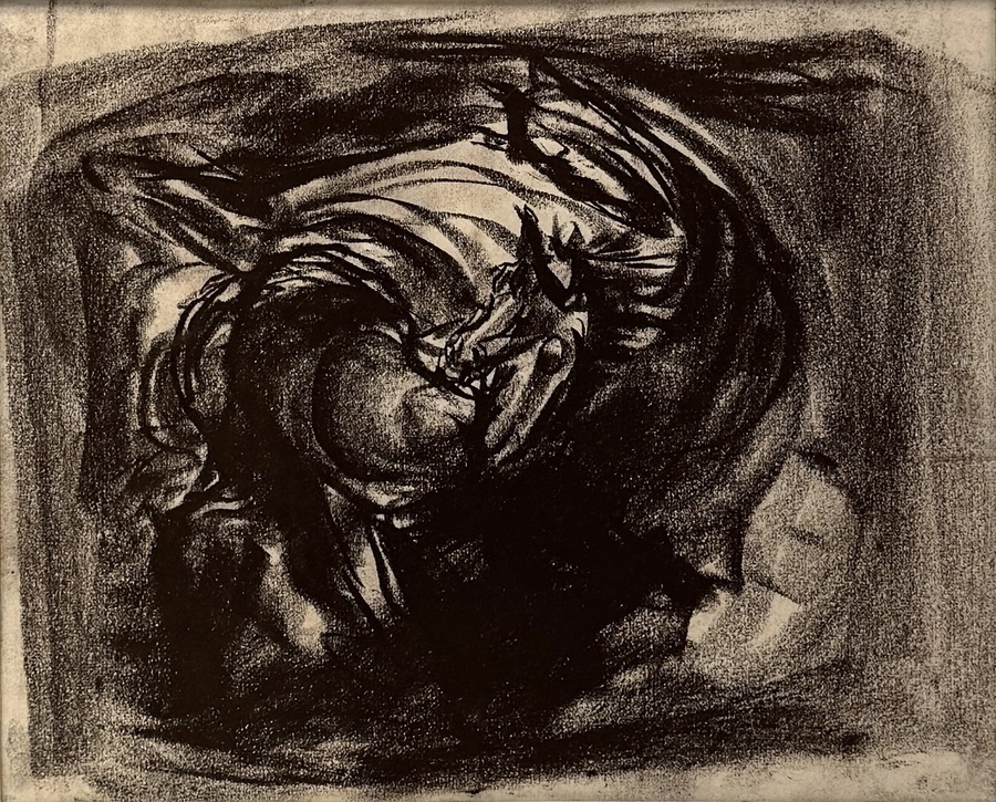 Expressieve litho, ca. 1950–1970, uitgevoerd in zwart-wit op papier. De voorstelling toont een abstract weergegeven paard in beweging, omgeven door krachtige lijnvoering en dramatische licht-donkercontrasten. Ongesigneerd, ingelijst achter passe-partout in goudkleurige lijst met florale reliëfdecoratie.