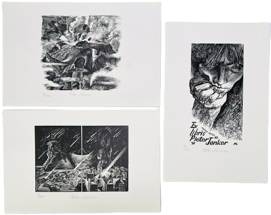 Een grafiekmap van Peter Lazarov (1958) met diverse houtsneden, gedateerd 1991/92. De expressionistische werken in zwart-wit tonen figuratieve en psychologische thema's waaronder landschappen en een ex libris met portret. Elke houtsnede is met potlood gesigneerd Peter Lazarov en genummerd 89/400. Ex libris is gedateerd 22 '94. De map bevat een introductie tekst.