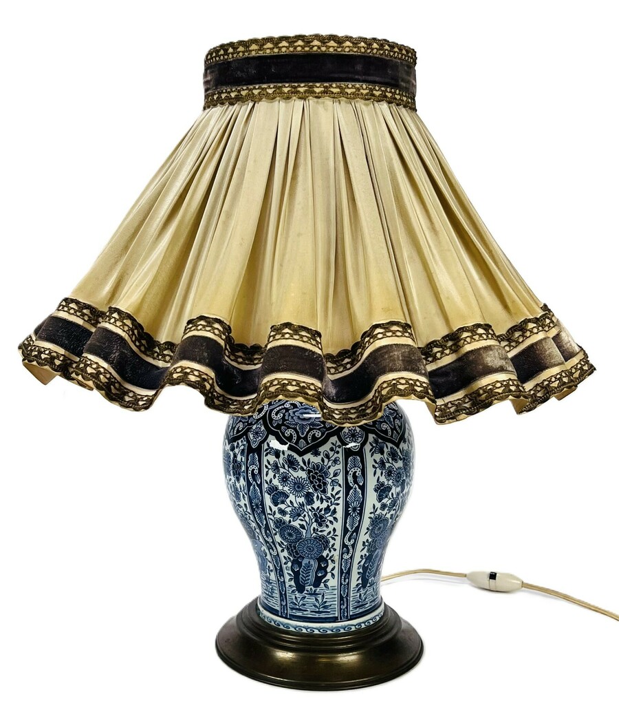 Keramische tafellamp met messing voet en geplooide stoffen kap, uitgevoerd in Delftsblauwe stijl, midden 20e eeuw. De vaasvormige voet is geglazuurd en beschilderd in blauw op wit, met bloemmotieven in verticale panelen. De kap is van crèmekleurig textiel, afgezet met zwarte fluwelen en kanten biezen. Elektrische fitting met snoer en stekker.