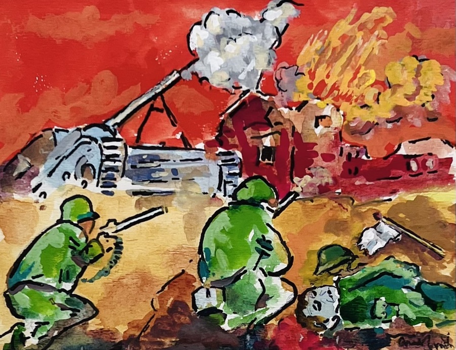 Gemengde techniek op papier van Arie Zuidersma (1925–2014), getiteld "De roep naar het licht", gedateerd 22 september 2011. Expressionistische voorstelling van een oorlogsscène met soldaten, explosies en brandende gebouwen. Rechts onder gesigneerd, achterzijde voorzien van titel, techniek en datering.