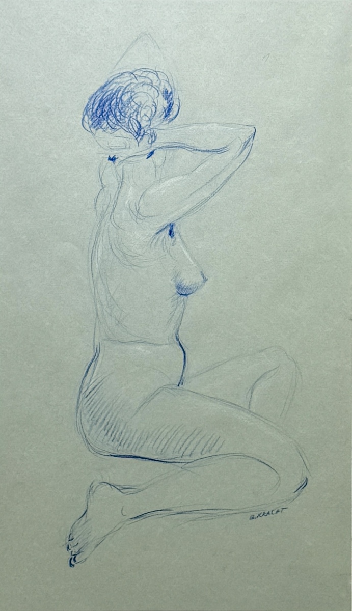 Modelstudie potloodtekening op papier door Bé Kracht (1933), van een naakte zittende vrouw in blauw potlood met contourlijnen en arcering, gesigneerd rechtsonder, 20e eeuw. De totale compositie toont een naturel figuurstudie in een direct, realistisch-naturalistische stijl die het lichaam in zij en rug aanzicht verbeeldt, uitgevoerd als klassieke kunststudie modeltekening.