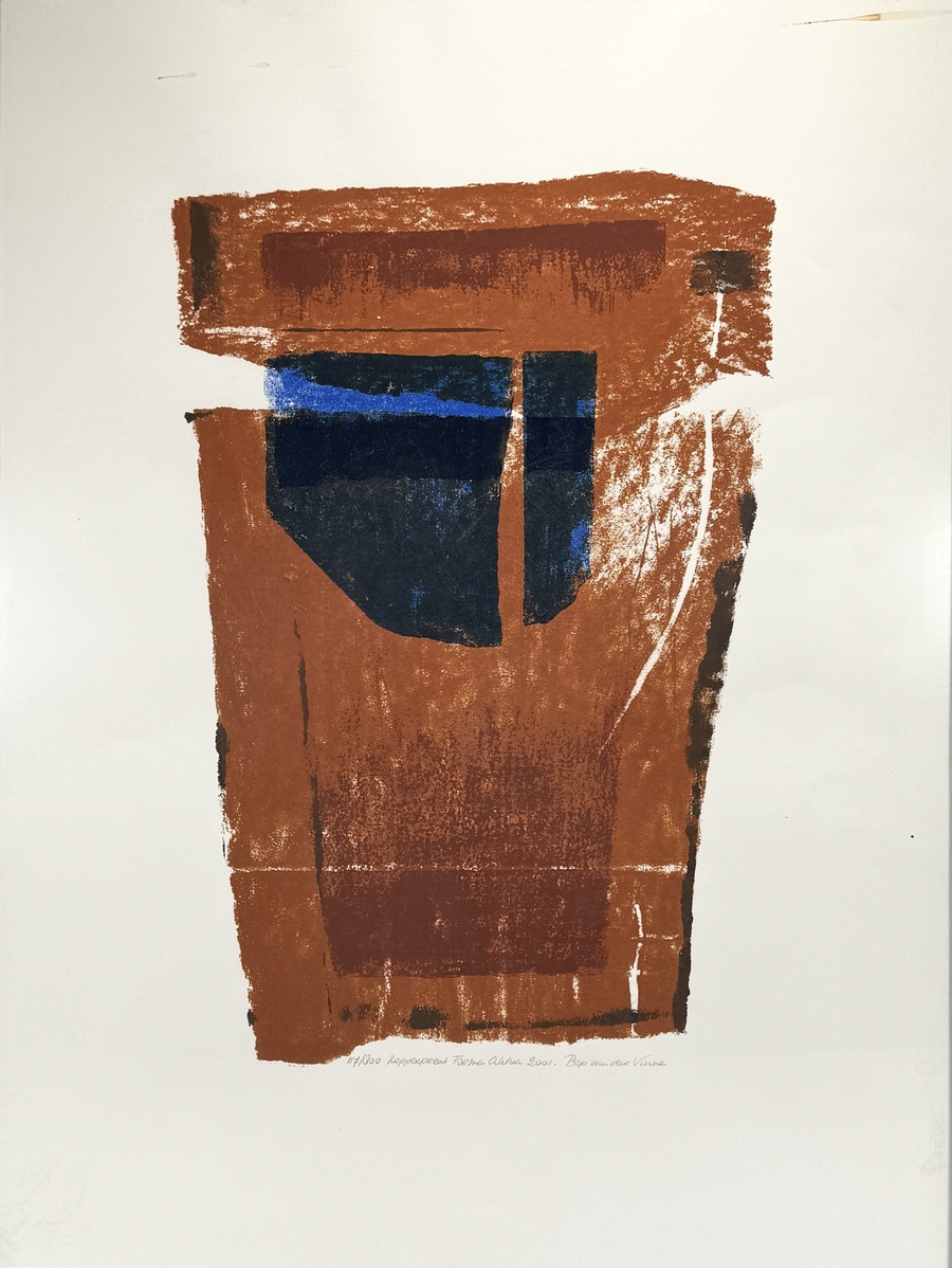 Koppermaandagprent door Bep van der Vinne getiteld, 2001. Uitgevoerd op papier, onderin in potlood vermelding oplagenummer 117/800, Kopperprent Forma Aktua 2001 en naamsvermelding. Abstracte compositie met geometrische vlakken in roestbruin, donkerbruin en blauw.