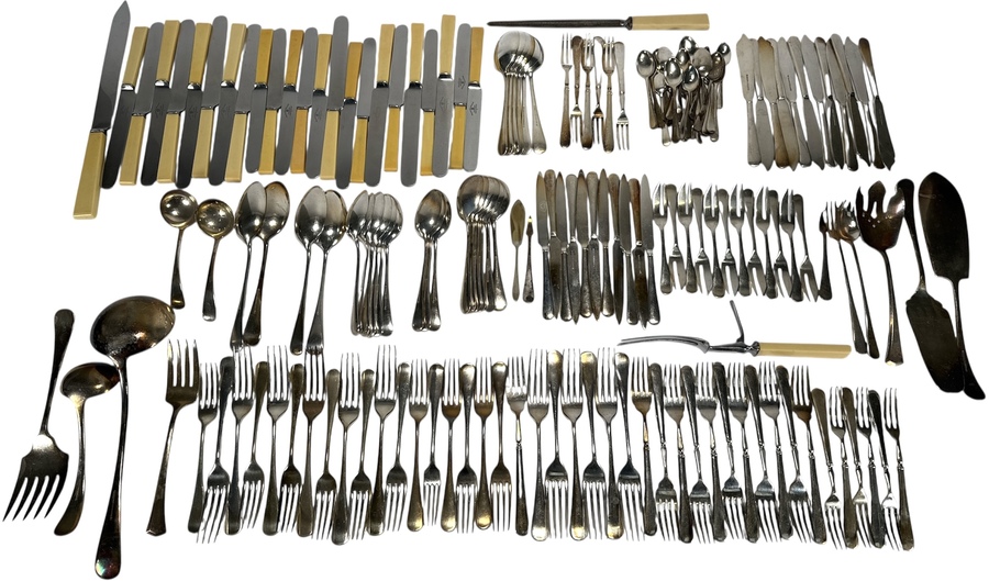 Uitgebreide bestekset van metaal, deels met lichtkleurige heften, bestaande uit tafelmessen, vorken, lepels, dessertbestek en diverse serveeronderdelen. Het bestek heeft een klassiek, tijdloos ontwerp met eenvoudige lijnen en geprofileerde details.