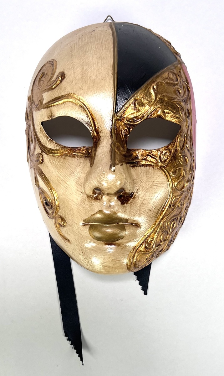 Dit masker, daterend uit midden 20e eeuw (circa 1950-1980), is uitgevoerd in de Venetiaanse maskeradestijl. Het masker is gemaakt van papier-maché en asymmetrisch gedecoreerd in goud, zwart, roze en beige, met opvallende vergulde krulmotieven. Zwarte satijnen linten zijn bevestigd voor het dragen.