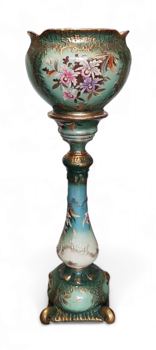 Polychrome beschilderde aardewerk cache-pot op bijpassende piëdestal, beide gedecoreerd met bloemen. Eerste helft 20e eeuw, uitgevoerd in neorococo stijl. De cache-pot staat op een piëdestal met een vierkante basis en klauwpoten. Handbeschilderd met bloemmotieven in roze, paars en wit, goudkleurige rocailleornament en reliëfdecoratie op een groen-blauwe ondergrond.
