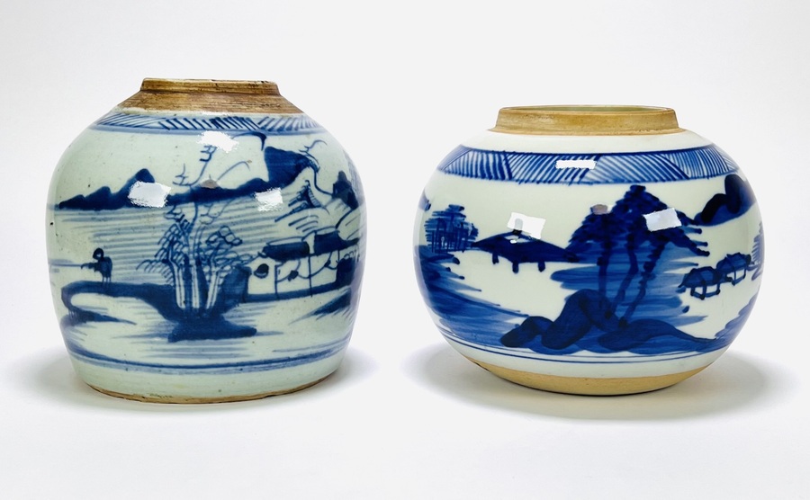 Twee porseleinen gemberpotten uitgevoerd in porselein met glazuur en handgeschilderde landschapsdecoratie in blauw-wit. Eén gemberpot onderzijde gemerkt met kalligrafische tekens, de andere ongesigneerd. China, 19e eeuw.