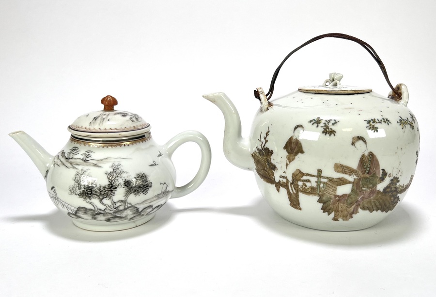 Twee Chinese porseleinen theepotten, 18e en 19e eeuw. Het kleinere exemplaar is uitgevoerd in wit porselein met fijn zwartgrijs landschapsdecor en bloemknop op de deksel. De grotere theepot heeft een metalen hengsel en meerkleurige voorstelling van figuren in een tuin met vergulding.