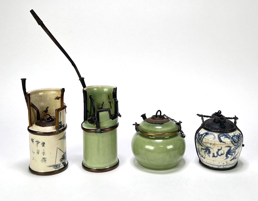Vier Chinese opiumpijpen, 20e eeuw. Uitgevoerd in porselein en aardewerk met koper- en messingbeslag, deels met blauwe onderglazuur decoratie, kalligrafische karakters en celadon glazuur. Twee cilindervormige met metalen pijpen en twee ronde potten met kettingdeksels, waarvan één met draakmotief in blauw-wit.