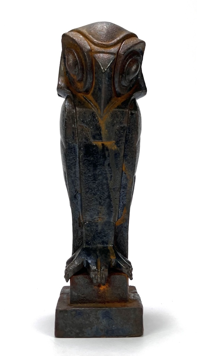 Dit gietijzeren beeld van een gestileerde uil is uitgevoerd in de Art Deco-stijl, laatste kwart 20e eeuw. Het object heeft een compacte, hoekige vorm met concentrische cirkels als ogen en vereenvoudigde vlakken voor het lichaam. Het staat op een vierkante basis en vertoont een donkere, roestige patina.