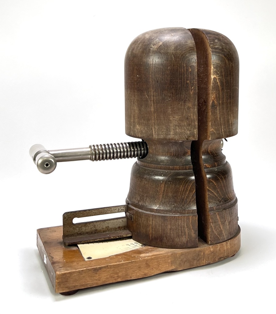 Deze houten hoedenspanner, daterend uit eind 19e eeuw – begin 20e eeuw, is ontworpen om maten van hoeden aan te passen. Het object bestaat uit een gespleten houten kop op een houten basis, aangedreven door een stalen schroefmechanisme. Voorzien van papieren schaalverdelingen, is dit een functioneel instrument in een industriële stijl.