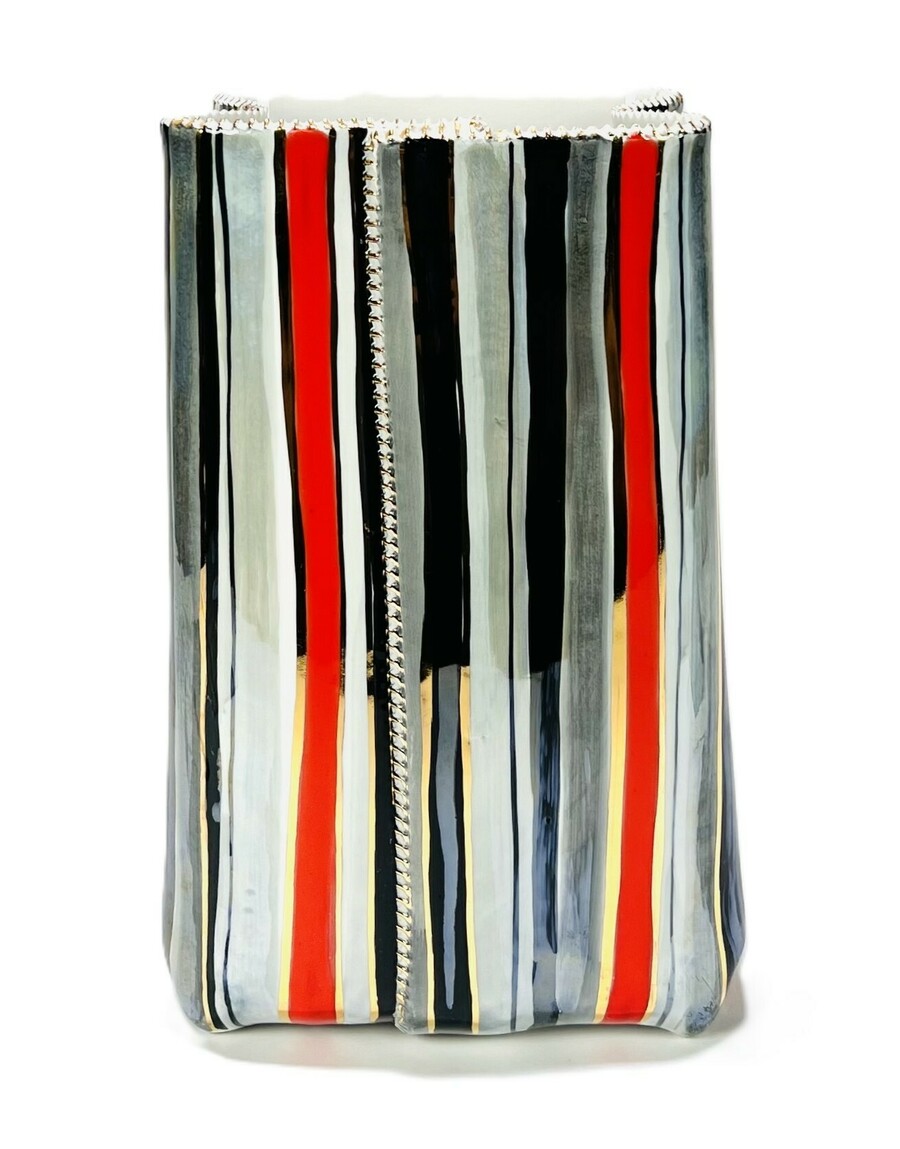 Porseleinen vaas, circa 1970-1990, uitgevoerd in een moderne abstracte stijl. De vaas heeft een vierkante, licht golvende vorm met een gekartelde bovenrand. Handbeschilderd met verticale banen in zwart, grijs, rood en goud. Onderaan gemerkt met “MADE IN ITALY” en genummerd 1113.
