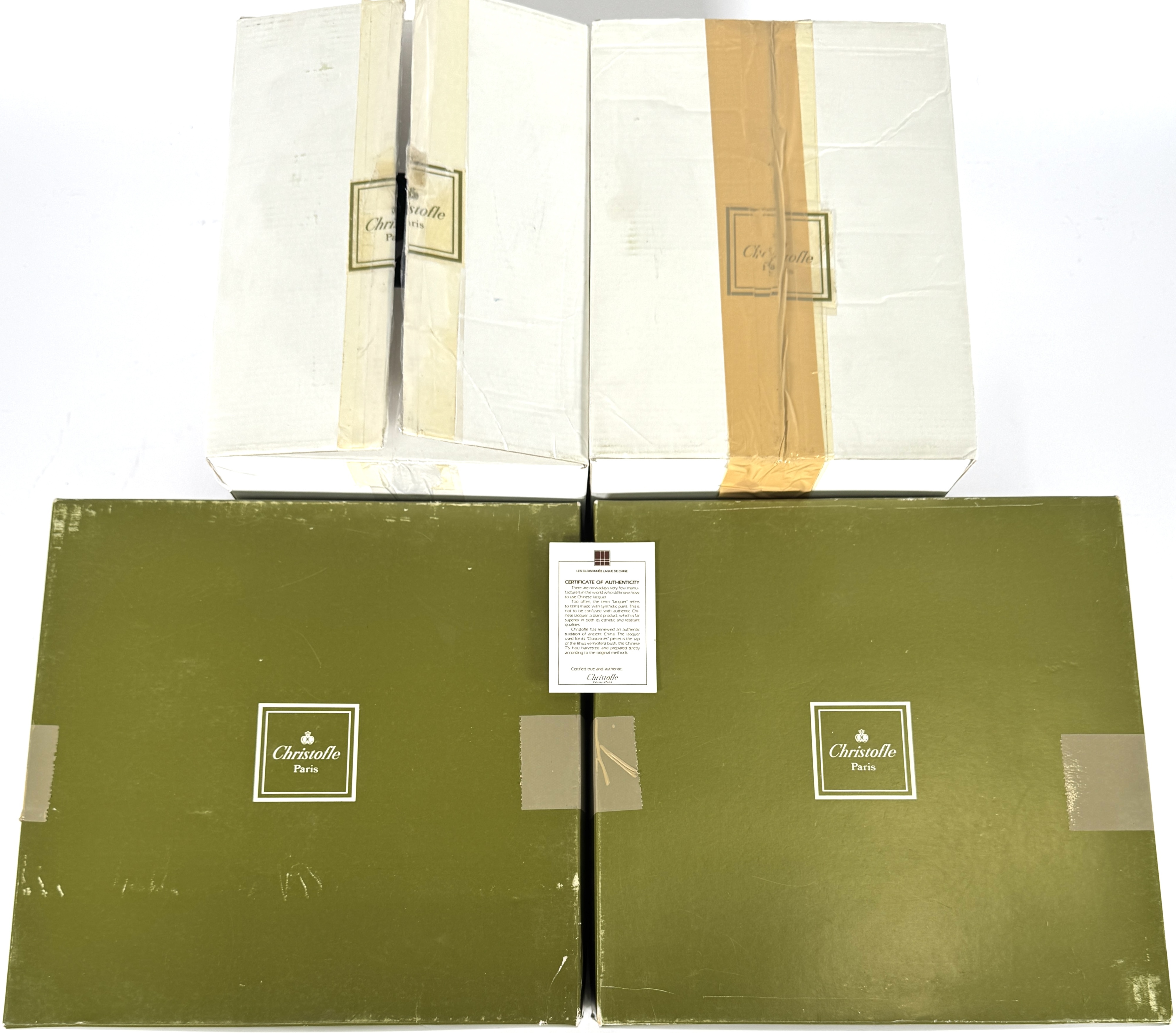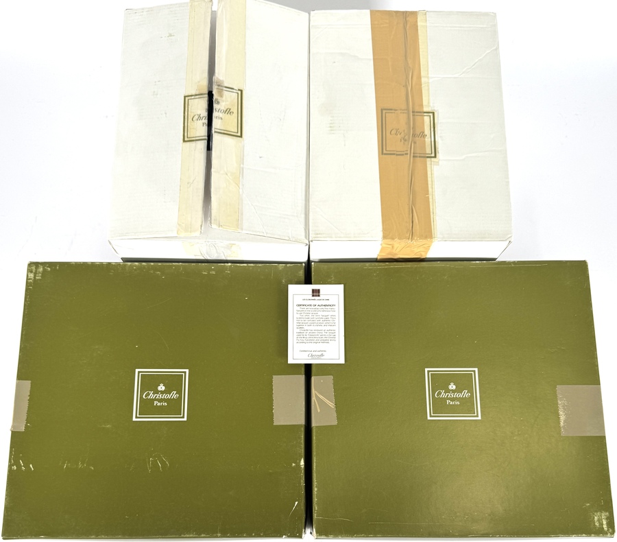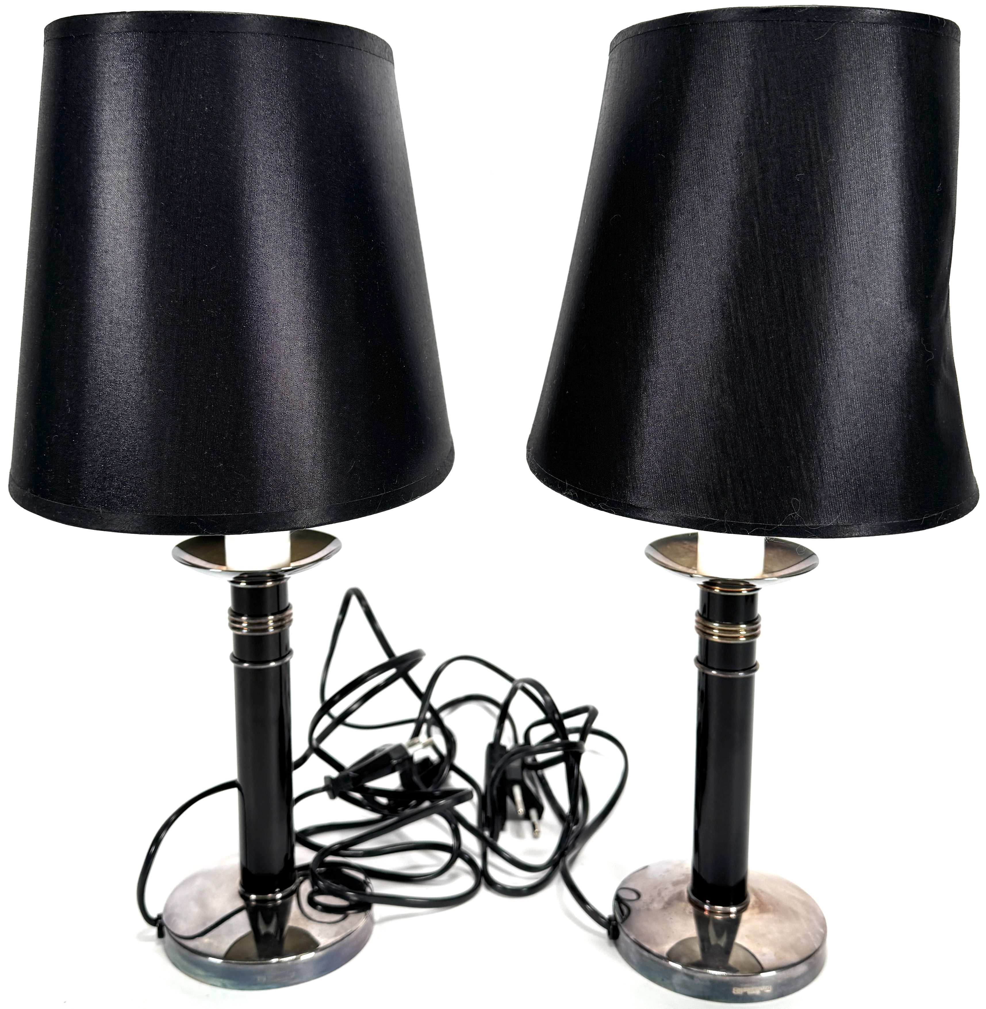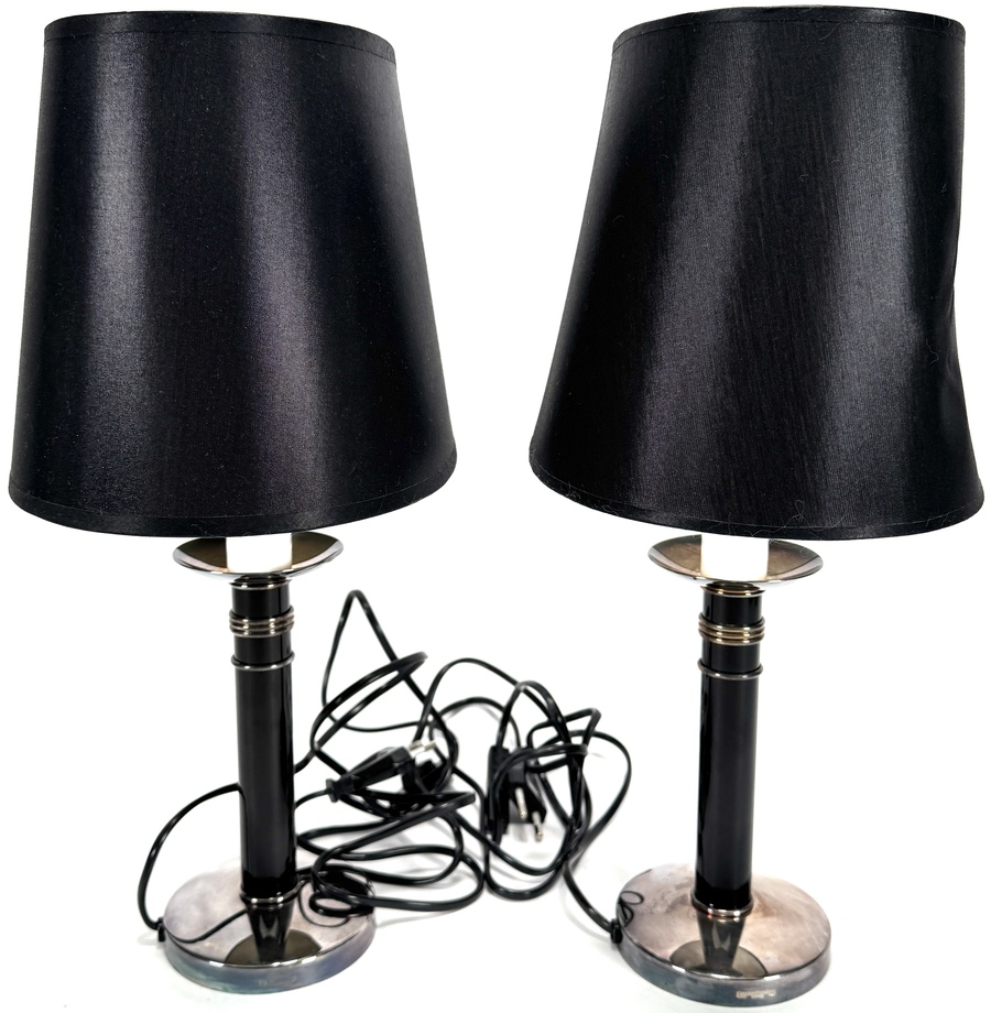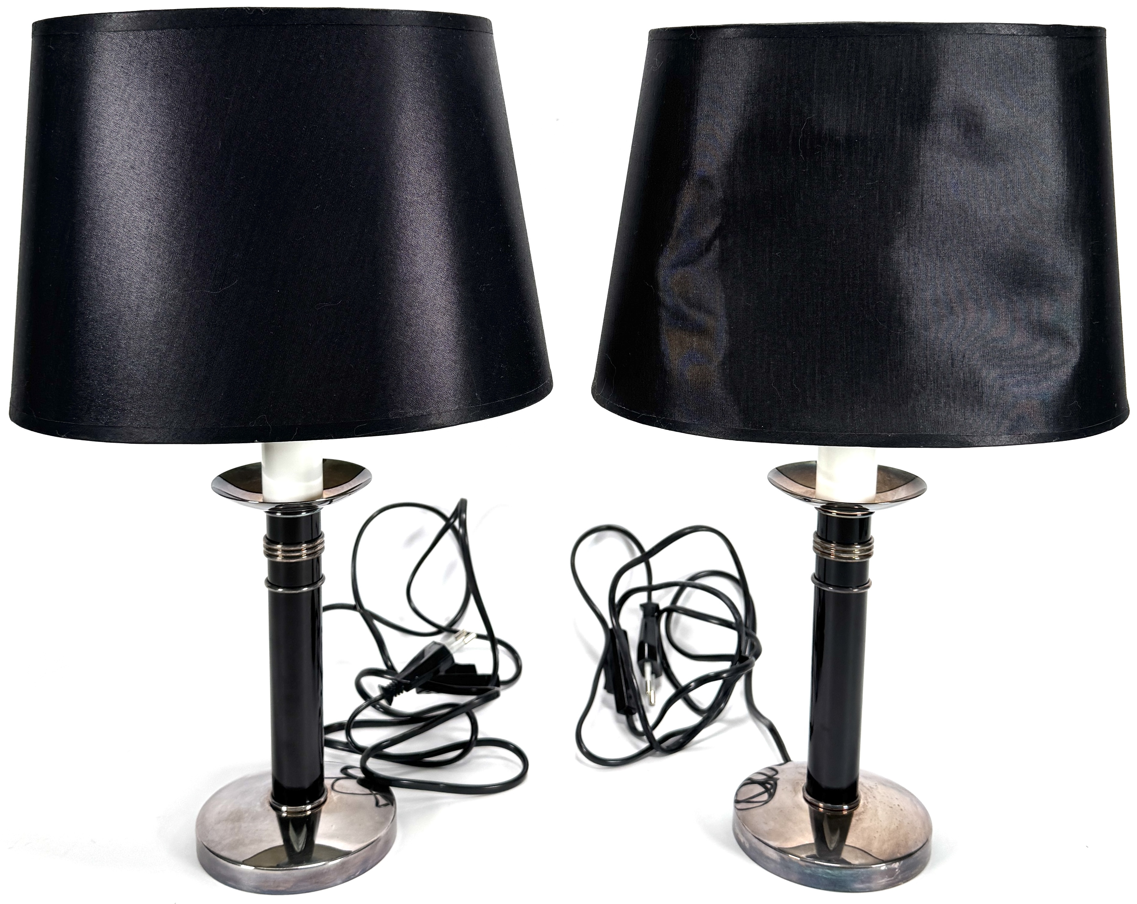 Twee lampen van Christofle Paris, eind 20e eeuw – begin 21e eeuw, uitgevoerd in metaal met verchroomde details en zwarte cilindrische voet, voorzien van zwarte textiele lampenkappen. De vormgeving is modern en strak, passend binnen luxe interieurdecoratie. Inclusief originele Christofle-dozen en certificaat van echtheid, wat de herkomst en authenticiteit van de set bevestigt. Zeker zijn van deelname? Plaats vanaf 22 augustus een schriftelijk bod online! |