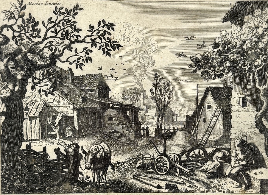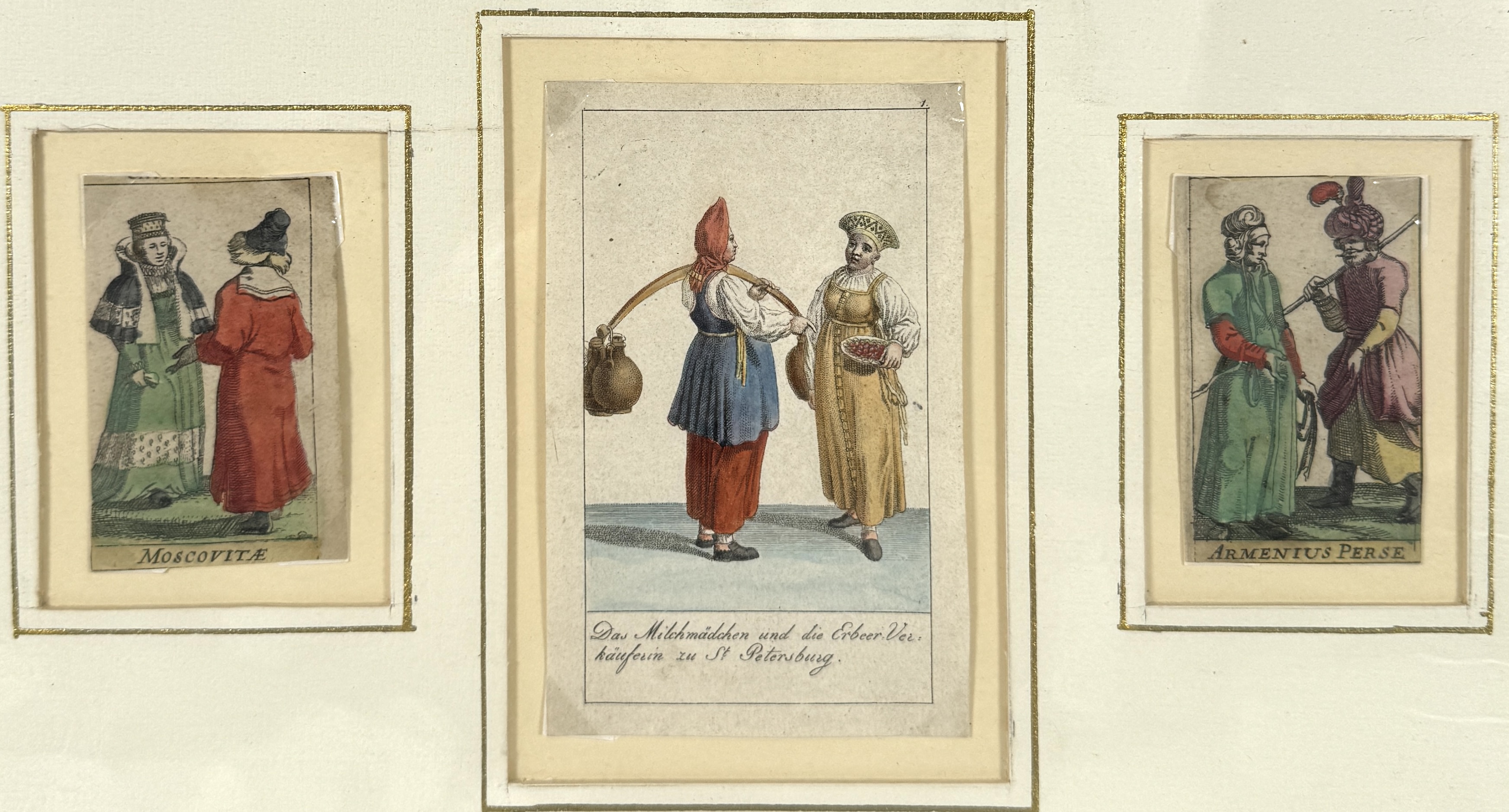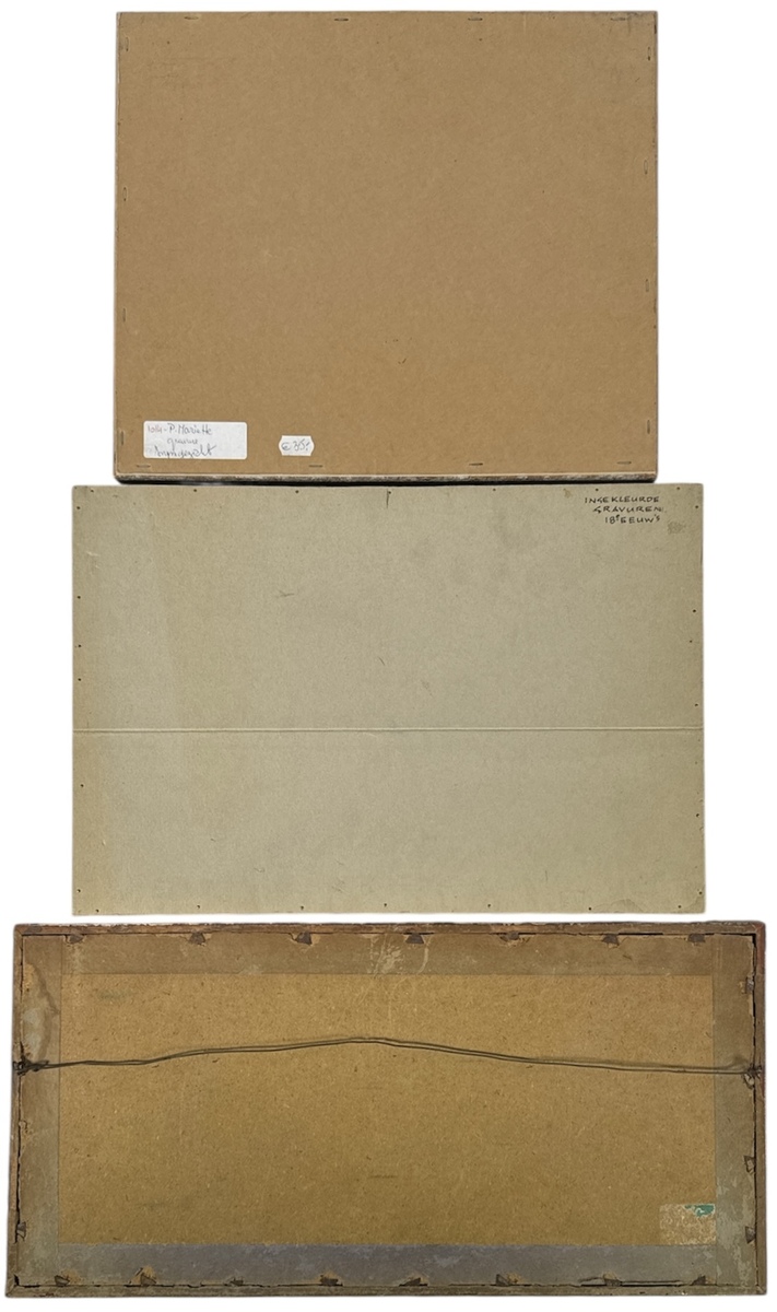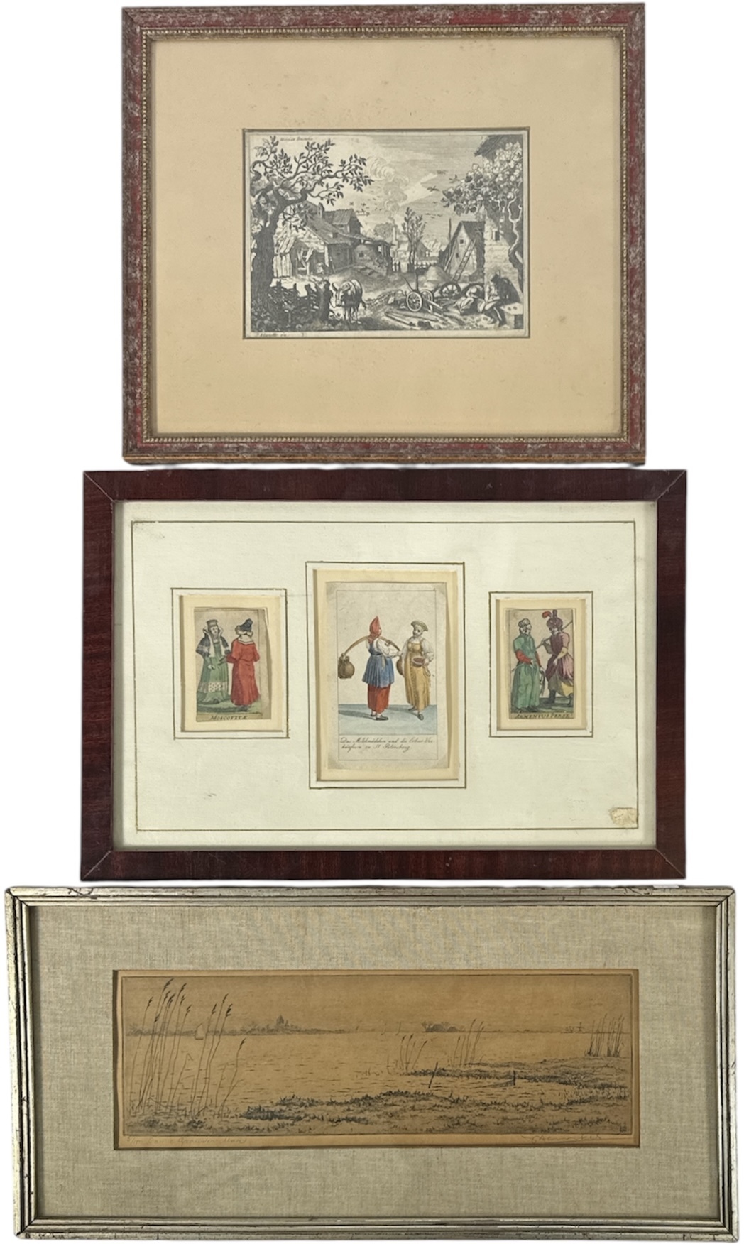Drie werken op papier: een 17e-eeuwse dorpsscène naar Matthäus Merian (1593–1650), een verzameling van drie 18e-eeuwse handgekleurde prenten met volkse kleding door Pierre Mariette (1603–1657) en een ets van Johan Hemkes (1894–1988), rechtsonder gesigneerd, met oplagenummer 3/150 linksonder. Uitgevoerd op papier in etstechniek, deels handgekleurd, alle gemonteerd in houten en goudkleurige lijsten. Jouw collectie verdient deze kunstwerken. Schrijf je in! |
