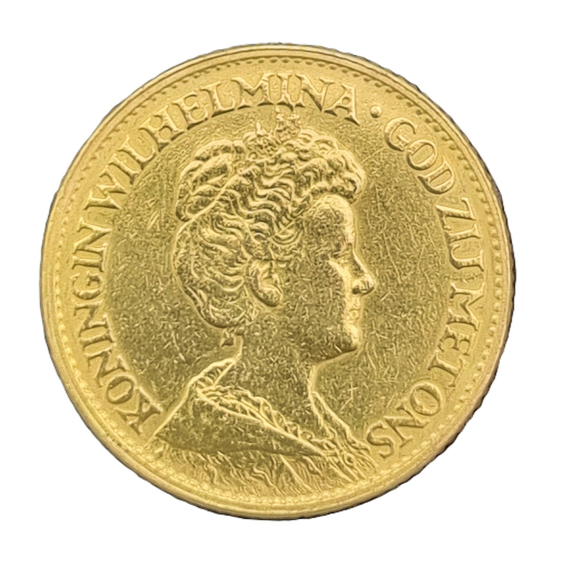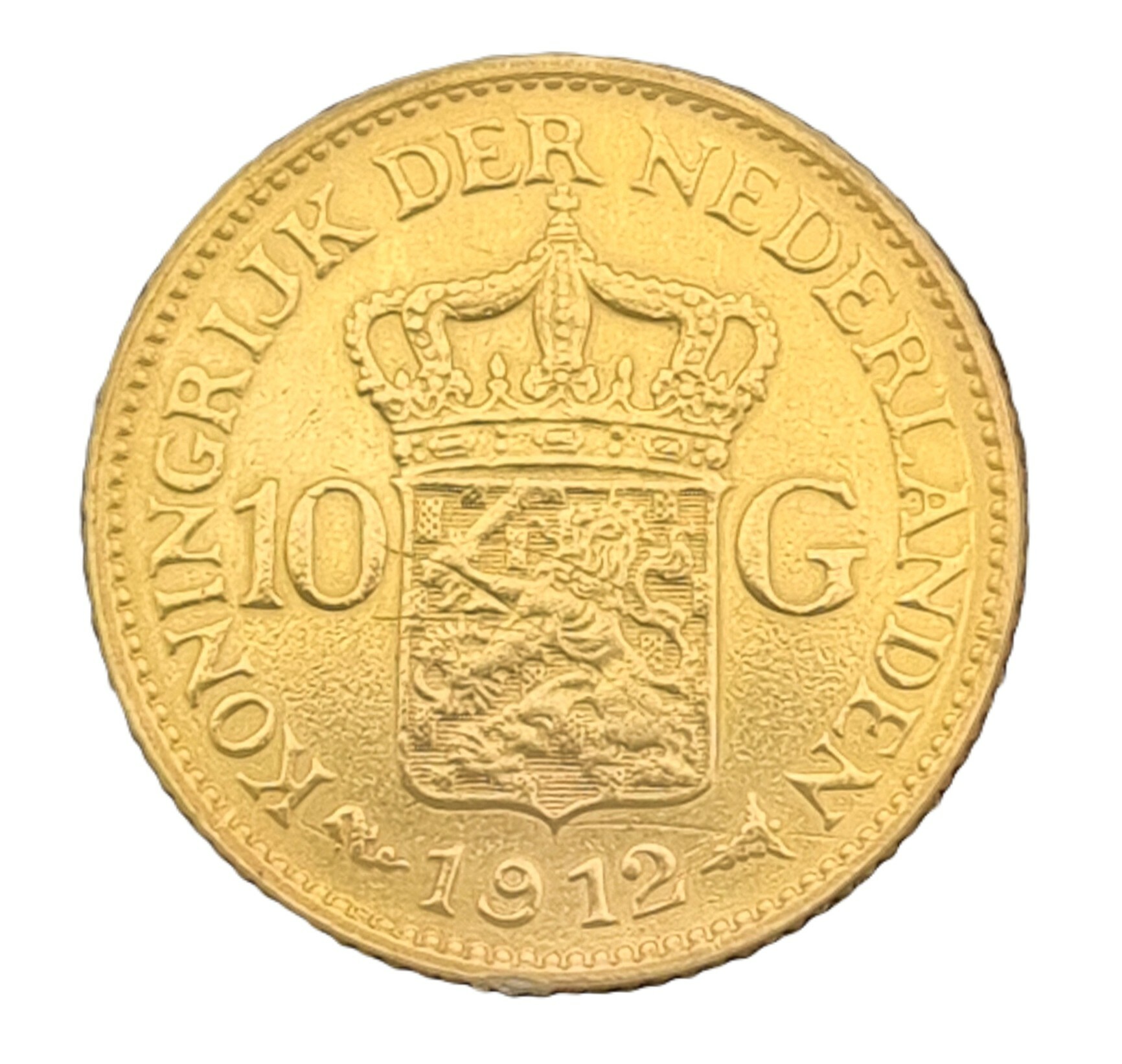 Gouden tientje Wilhelmina met hermelijnen mantel uit 1912, bevat 900/1000 goud en gemerkt met muntmeesterteken zeepaard. Rondom de munt is de tekst "KONINGIN WILHELMINA, GOD ZIJ MET ONS" geschreven en op de keerzijde is het gekroond Nederlands wapenschild afgebeeld. Het gouden tientje is ontworpen door J. C. Wienecke. Wil je dit gouden tientje in het echt bekijken? Kom naar de kijkdagen op 29, 30 en 31 augustus! |