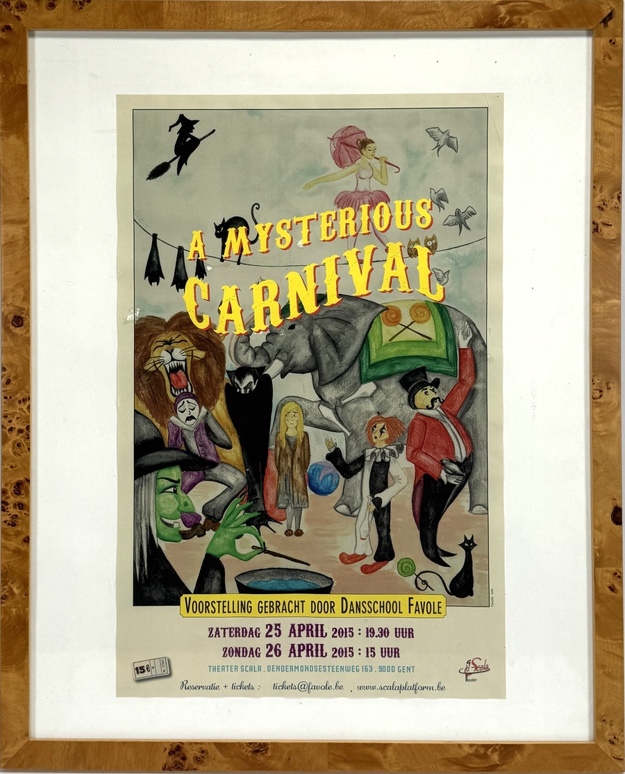 Een affiche in een figuratieve en illustratieve stijl getiteld "A Mysterious Carnival", gedateerd 2015. Het affiche is vervaardigd van papier en gedrukt door middel van offsetdruk. De voorstelling omvat een mix van circus- en horrorfiguren, zoals een leeuw, een heks en een olifant, in felle kleuren. De affiche werd uitgebracht door Dansschool Favole. Dit affiche zelf beoordelen? Je bent welkom op onze kijkdagen op 29, 30 en 31 augustus! |