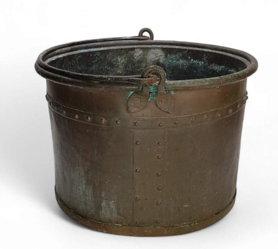 De koperen aker is vervaardigd in de late 19e eeuw en kenmerkt zich door een traditionele functionele stijl. De cilindervormige aker is gemaakt van koperplaten, die met klinknagels aan elkaar zijn bevestigd. De aker vertoont een natuurlijke patina en oxidatie, waaronder een groene verkleuring aan de binnenzijde. De constructie is met een handvat en twee bevestigingslussen. Wil je direct deelnemen? Plaats vanaf 22 augustus alvast een schriftelijk bod via onze website! |