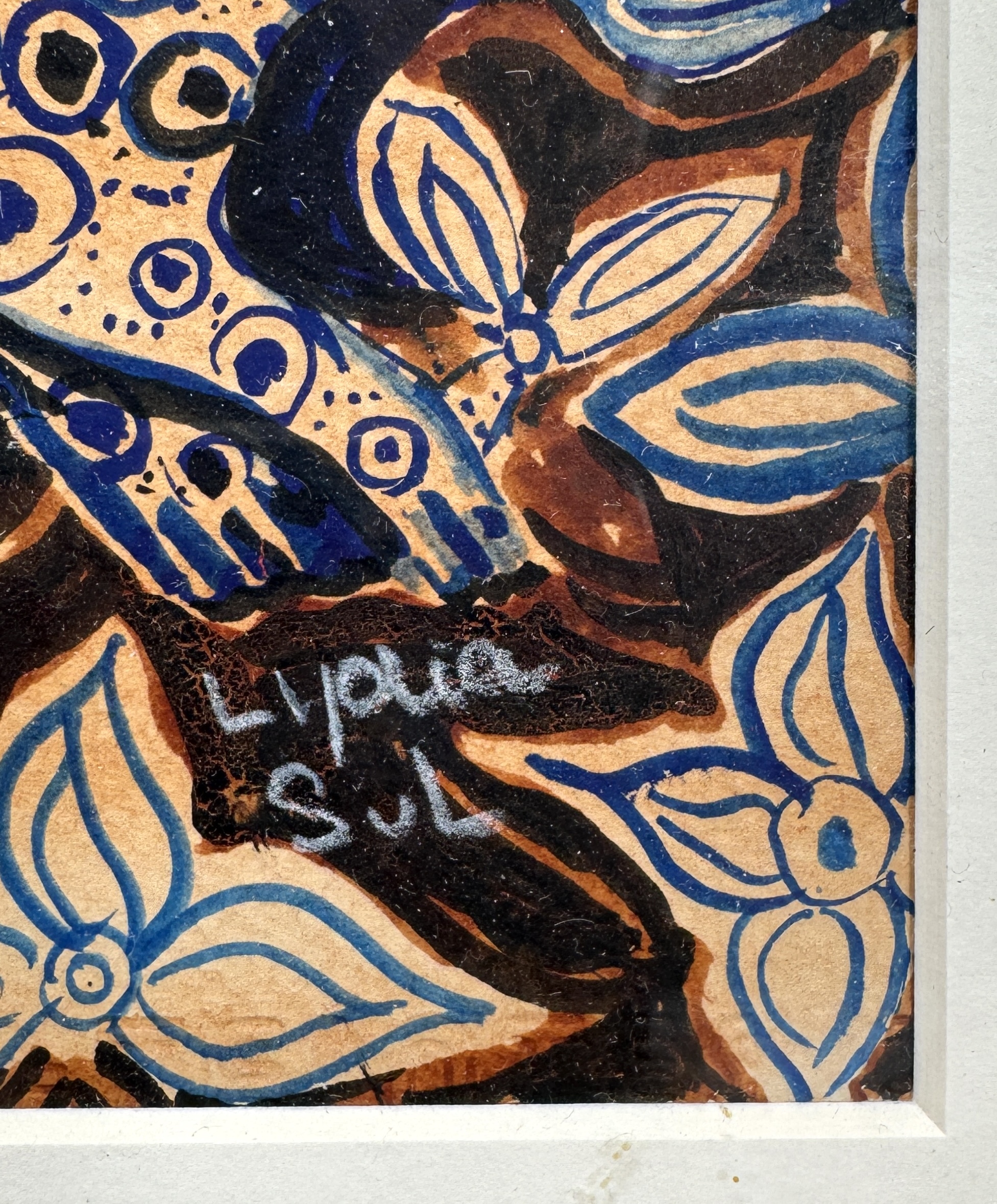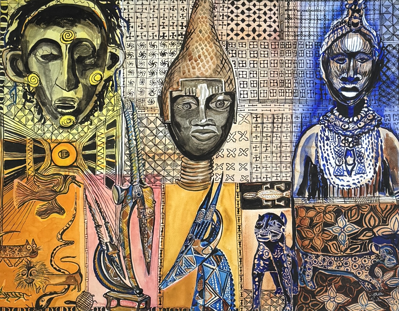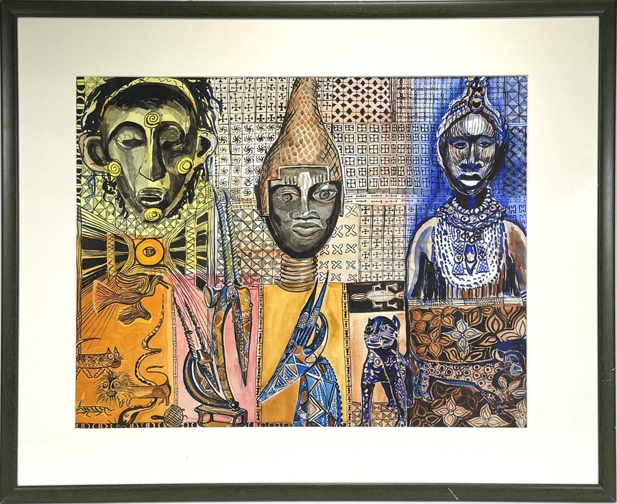 Tekening op papier in Afrikaanse stijl, rechtsonder gesigneerd “Lydia Sul”. Uitgevoerd in gemengde techniek (inkt en gouache) met oker-, blauw- en zwarte accenten. De voorstelling toont drie gestileerde hoofden, rituele voorwerpen, dieren en door textiel geïnspireerde patronen in vlakverdeling. Datering: tweede helft 20e eeuw. Kom langs tijdens de kijkdagen (29 t/m 31 augustus) en ontdek deze tekening zelf! |