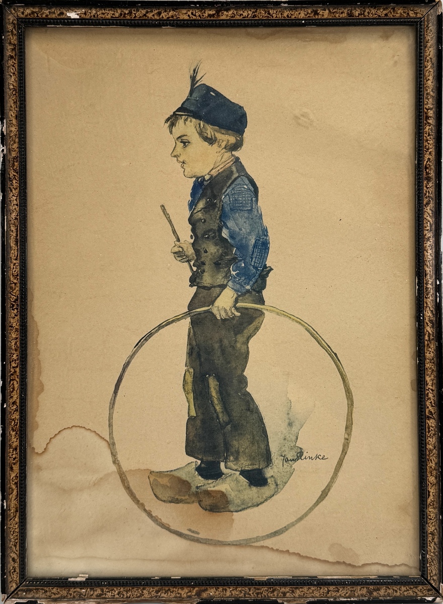 Aquarel op papier, voorstellend een kind in klederdracht met hoepel, in illustratieve stijl. Rechtsonder gesigneerd Jan Rinke (1863–1922), gedateerd omstreeks 1900. Geïnteresseerd? Bezoek onze kijkdagen voor een persoonlijke bezichtiging! |