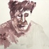 Aquarel van Joep Hiep, tweede helft 20e eeuw. Uitgevoerd op papier in expressieve stijl met schetsmatige penseelvoering. Voorstelling van een portret in bruinrode aquareltonen met onbewerkt gelaten achtergrond. Aan de achterzijde met potlood gesigneerd Joep Hiep.