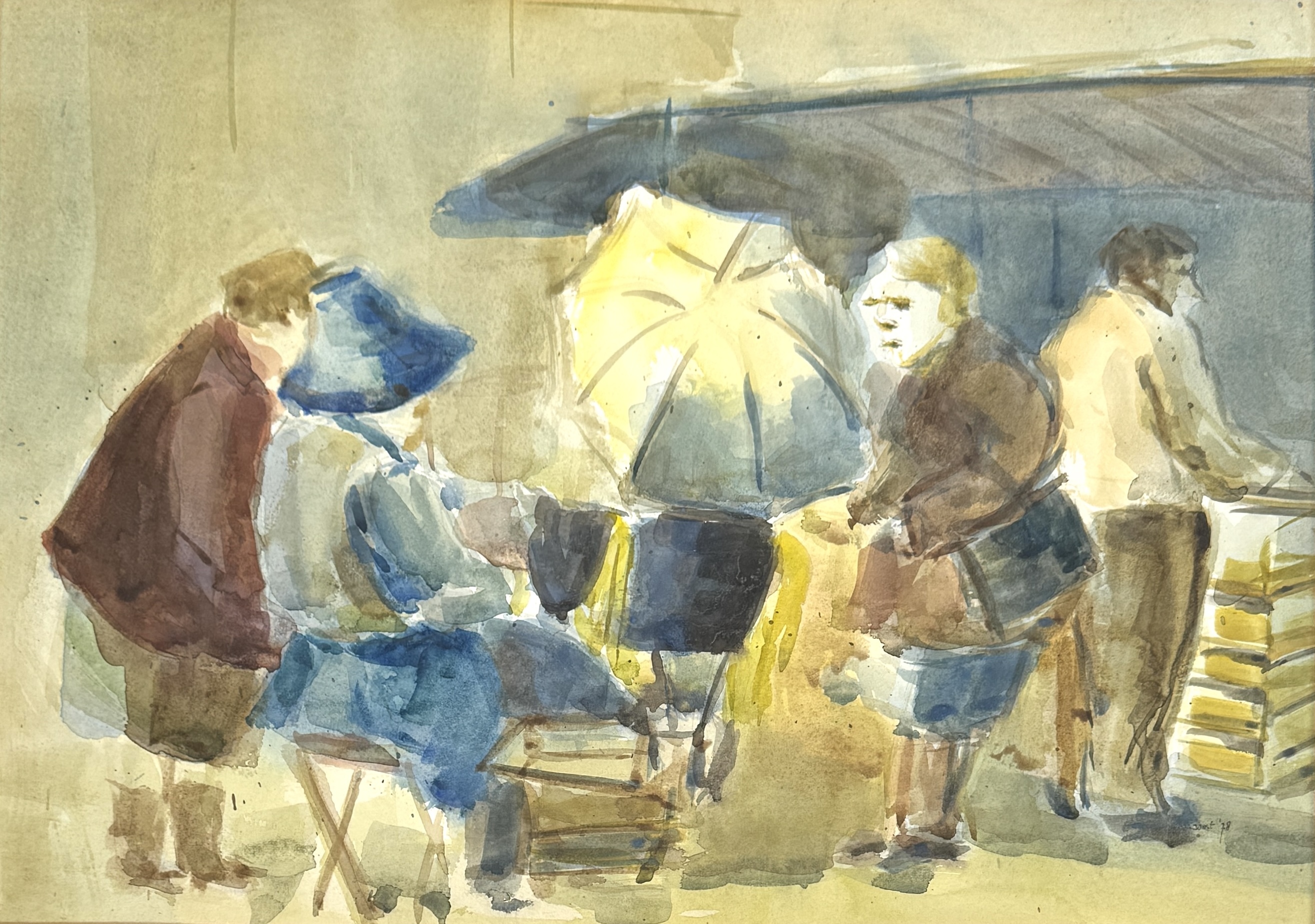 Aquarel Joost Schmidt, “Markt – Dieppe”, 1978, Frankrijk