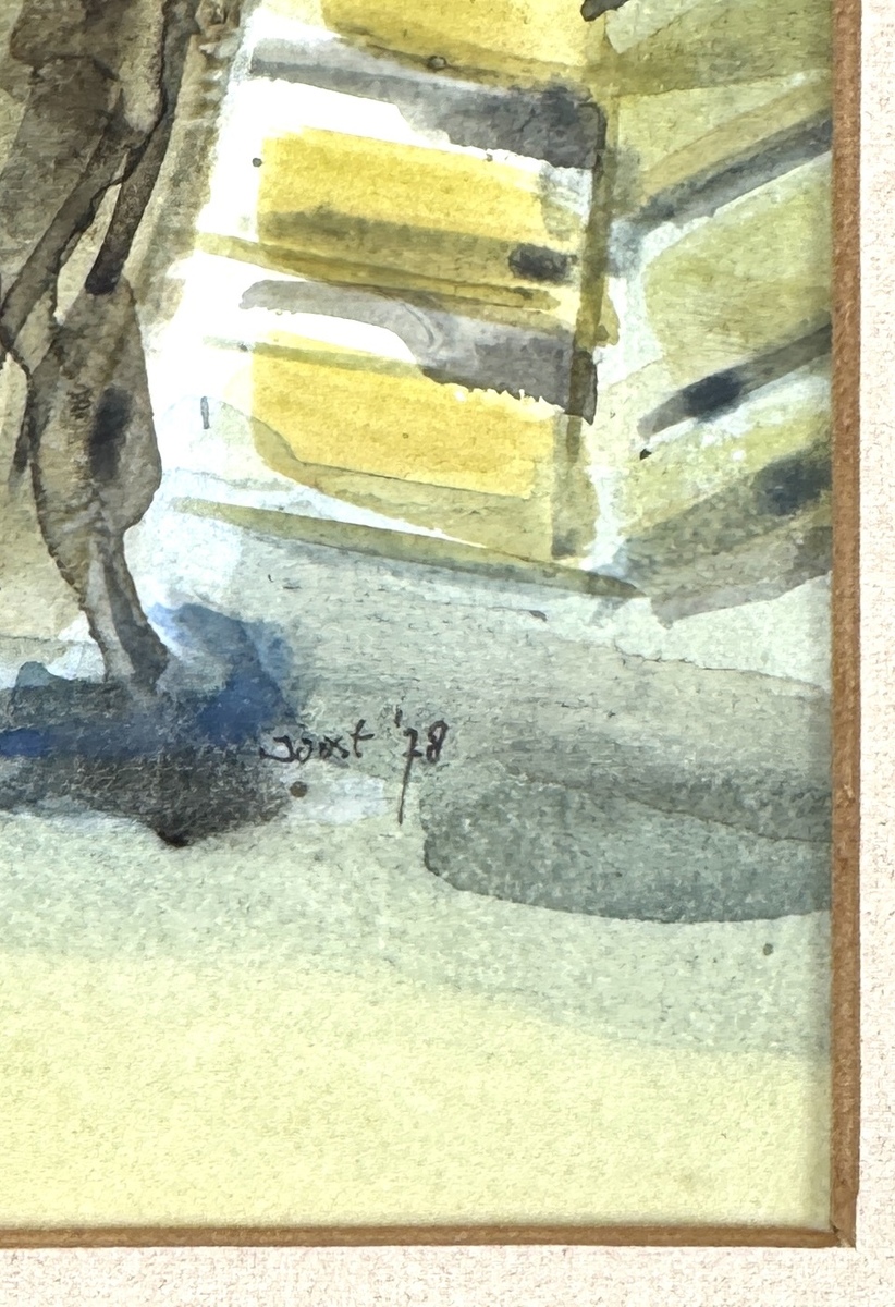 Aquarel van Joost Schmidt ((1943-2015), getiteld “Markt – Dieppe”, 1978. Rechtsonder gesigneerd “Joost” en gedateerd “78”. Voorstelling met figuren, marktkramen en parasol, in abstraherend-naturalistische stijl met transparante wassingen. Verso etiket met informatie.